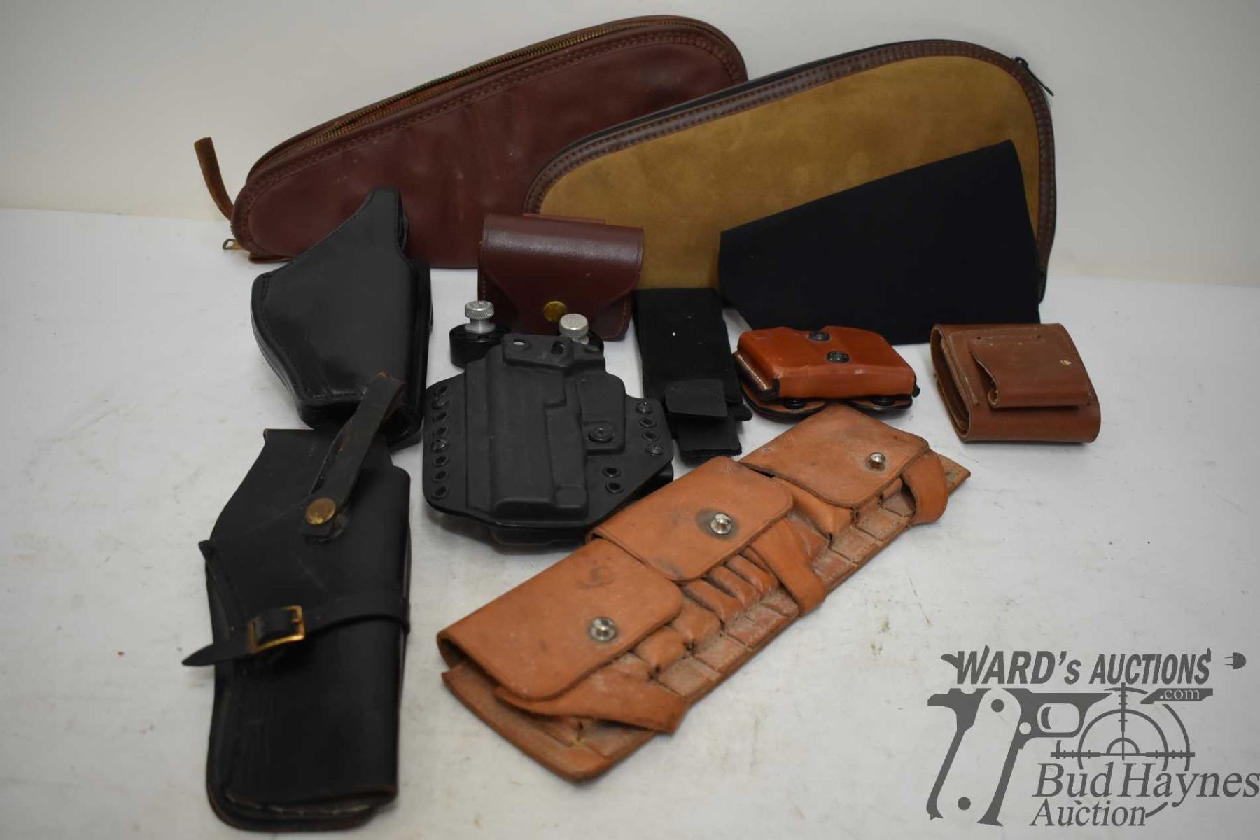 Two soft pistol cases, four leather ammp pouches, two leather holsters and one hard plastic holster