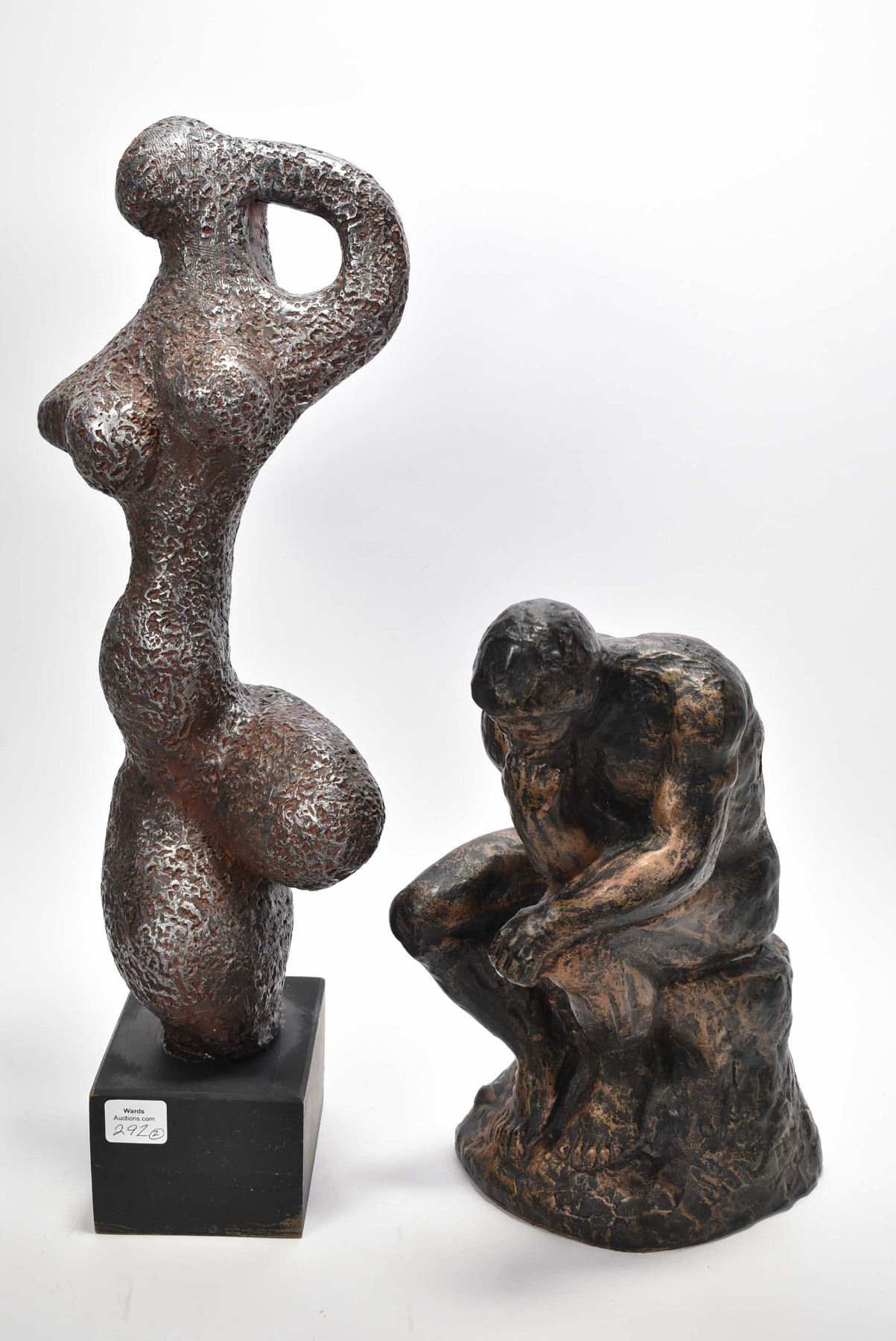 Two statues including clay abstract on wooden base 18" in height and of Rodin's "The Thinker"