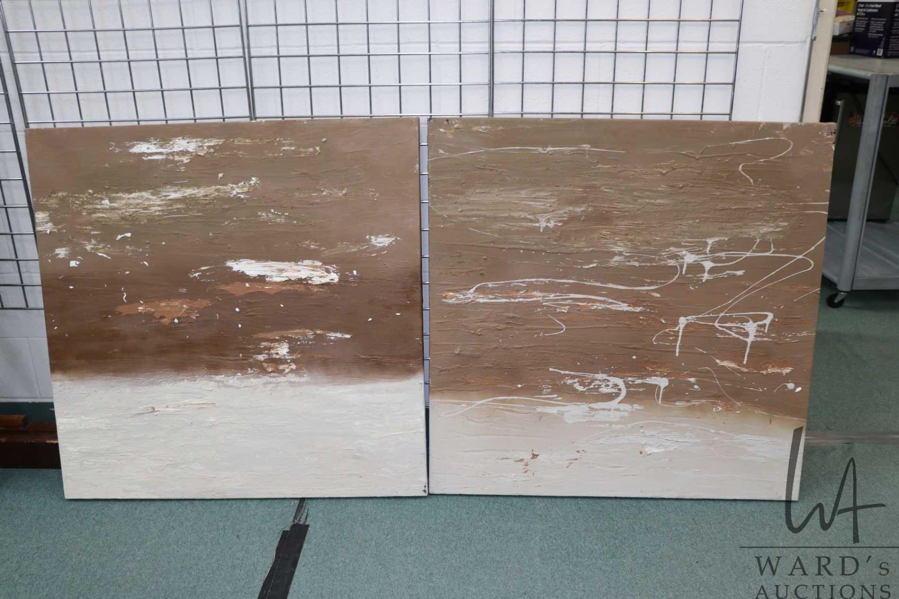 Two stretcher framed acrylic on canvas painting, no artist signature seen, each 40" X 40, note: local showhome decor. NOTE: This is too large to ship through most couriers and will be expensive to ship. Artwork cannot be insured. Local pickup only.