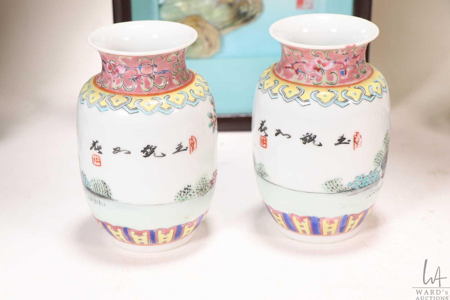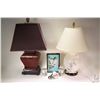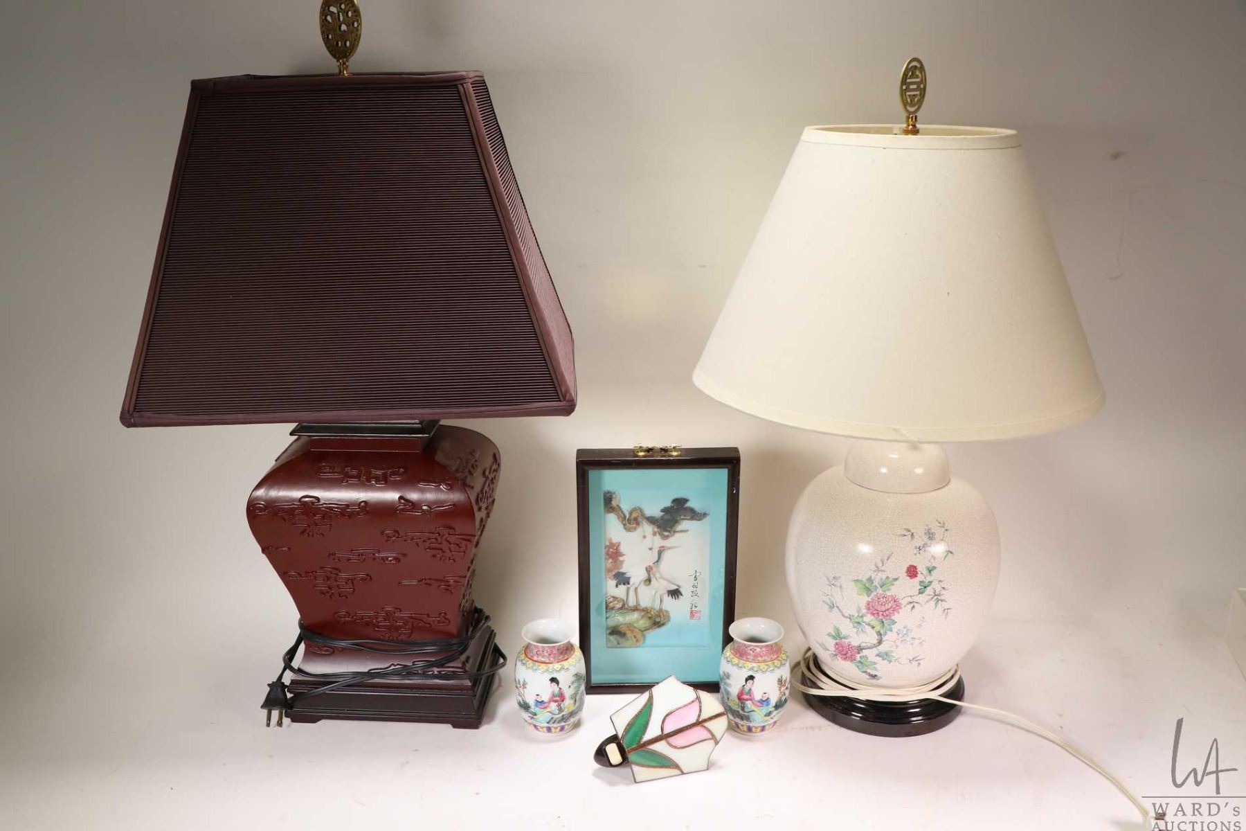 Two table lamps including one Oriental influenced and selection of collectibles including shadow boxed stork pictures, slag glass night light and two 4" high hand painted vases