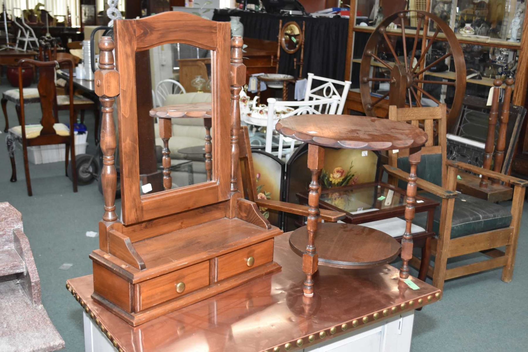 Two tier occasional table and a semi contemporary single drawer vanity mirror