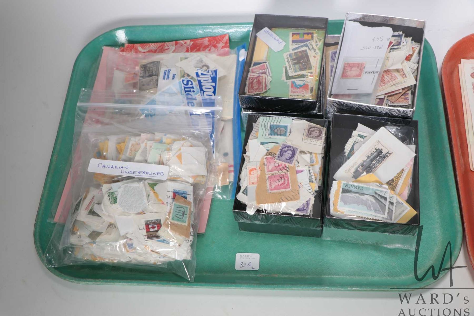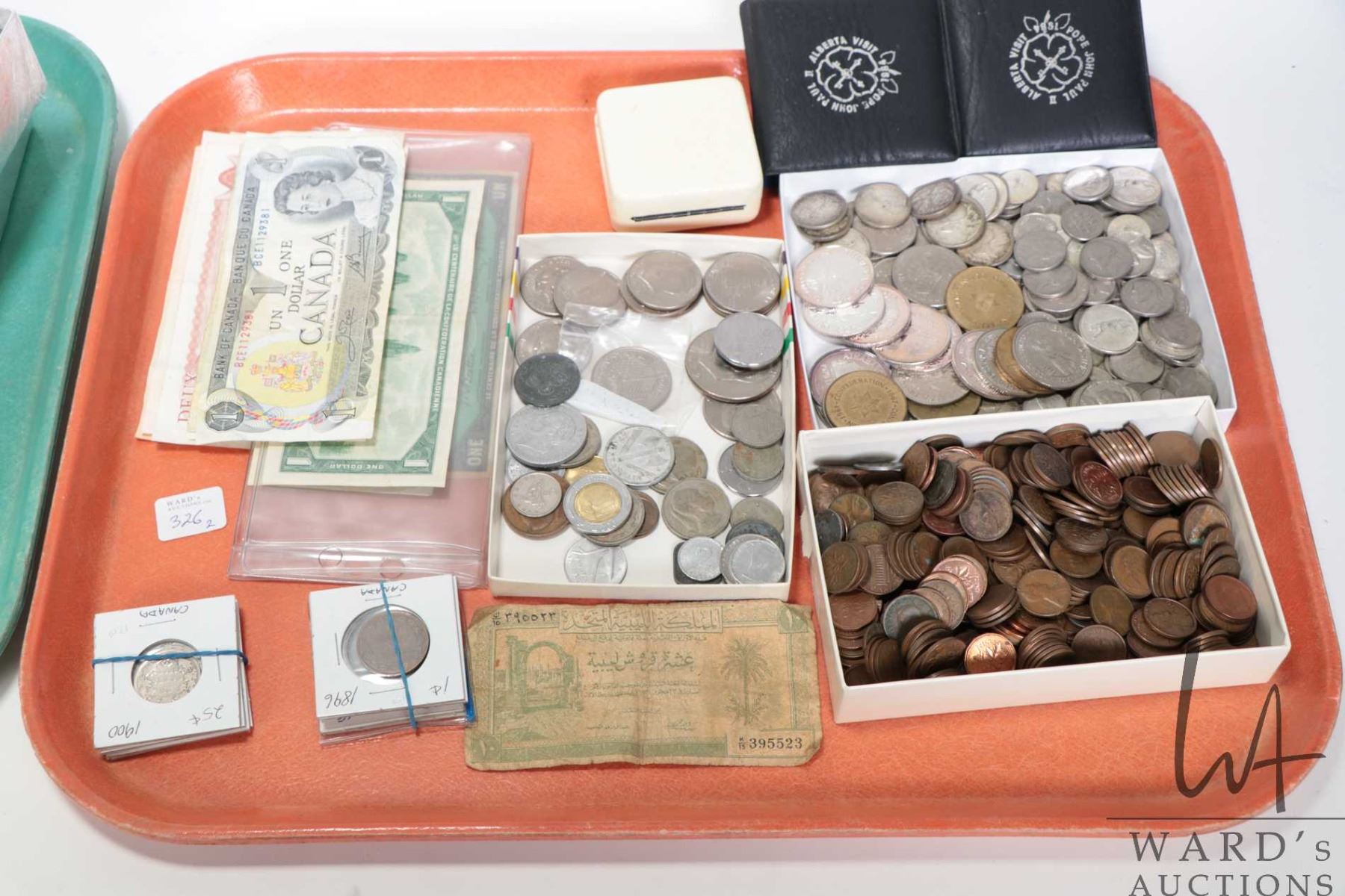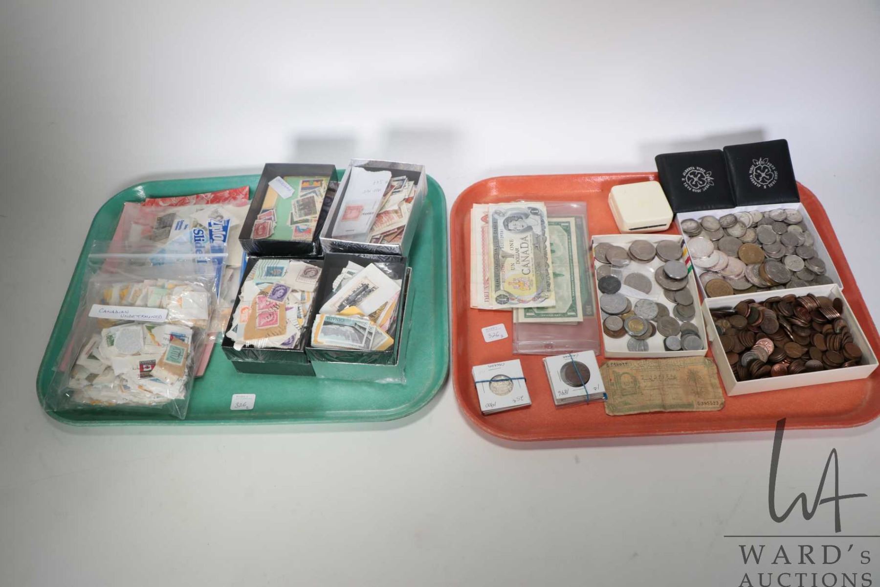 Two tray lot of vintage stamps and coins including three boxed Pope coins circa 1984, six $1 dollars and four $2 dollar bills, various year, selection of Canadian coins including nickels, dimes, quarters and dollar coins, large selection of mixed American and Canadian pennies, some American liberty dollars including 1971 Eisenhower and Kennedy dollars etc. plus a large selection of Canadian stamps