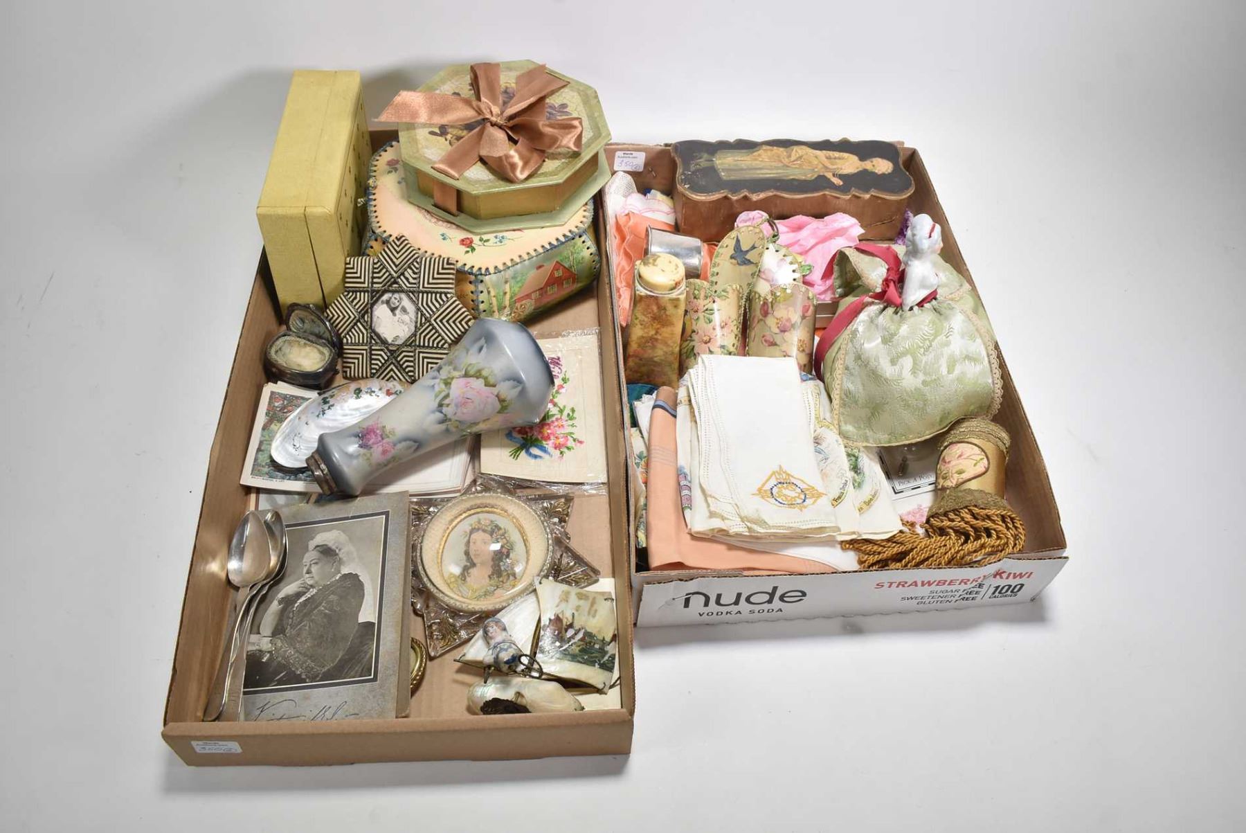Two tray lots of assorted ephemera and collectibles including Queen Victoria portrait, illustrated calendar blanks, leather lined shell change purse, embroidered postcard, handkerchiefs, pin cushion doll etc.