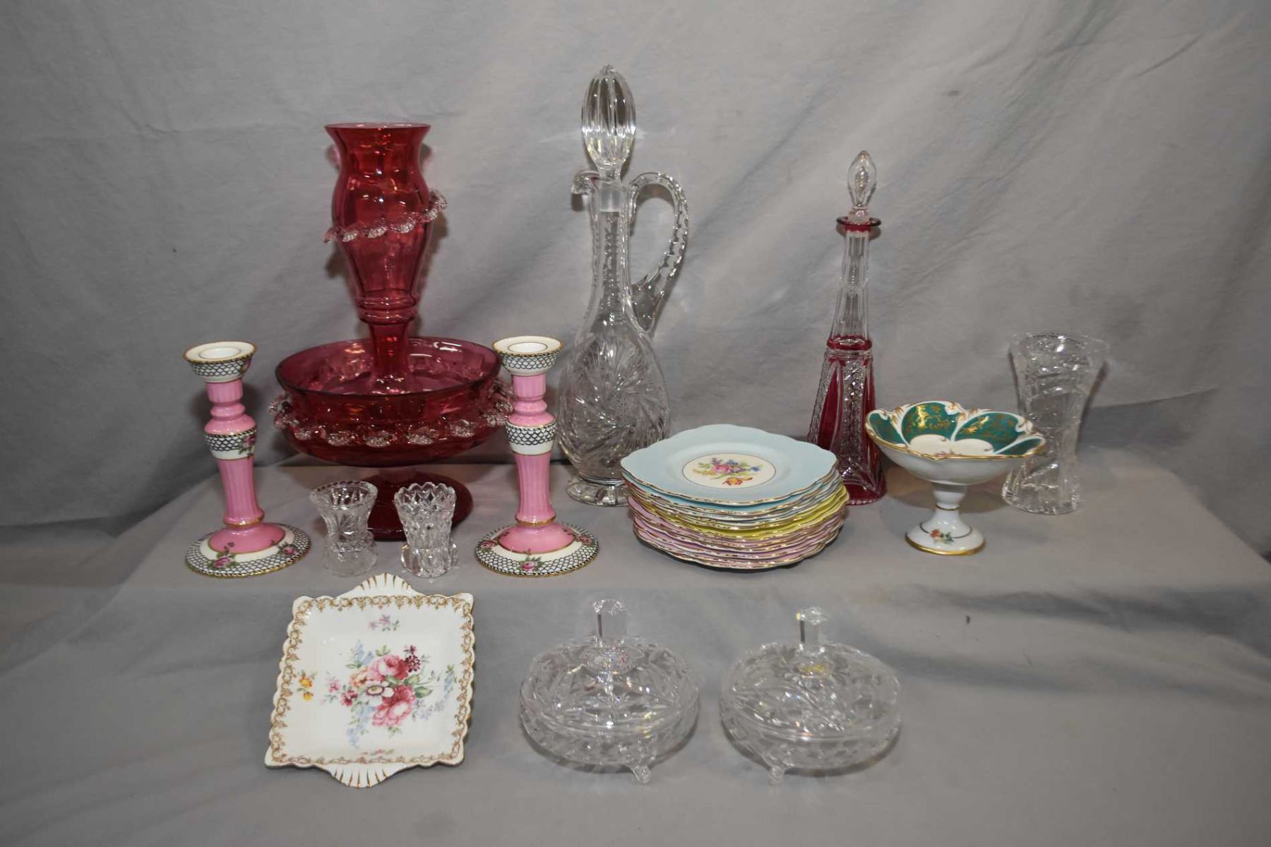 Two tray lots of collectible glass and porcelain including twelve Grafton side plates in three colours, small German comport, Crown Staffordshire handled dish, pair of Aynsley candlesticks, single trumpet epergne, note 1" crack in top of trumpet, nothing missing, two decanters, two lidded crystal dishes etc.
