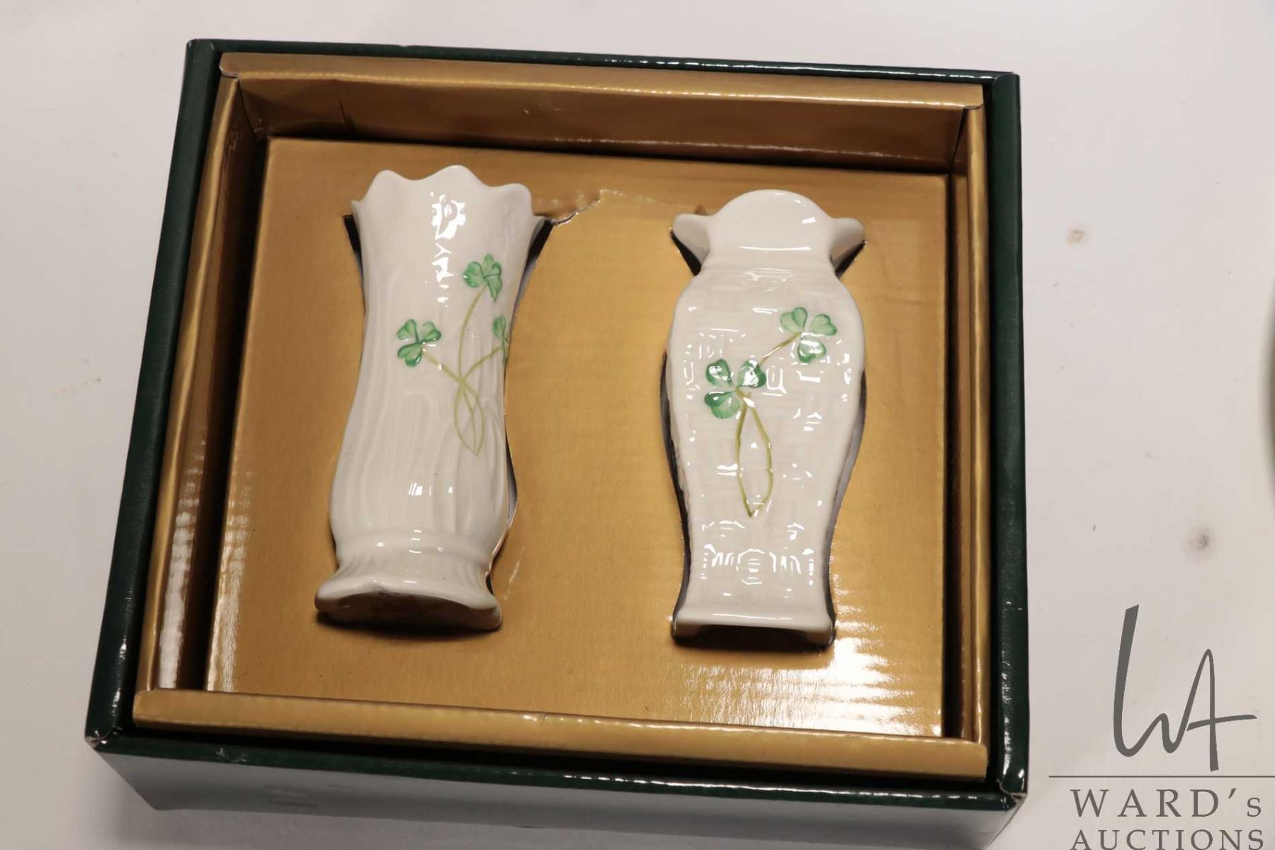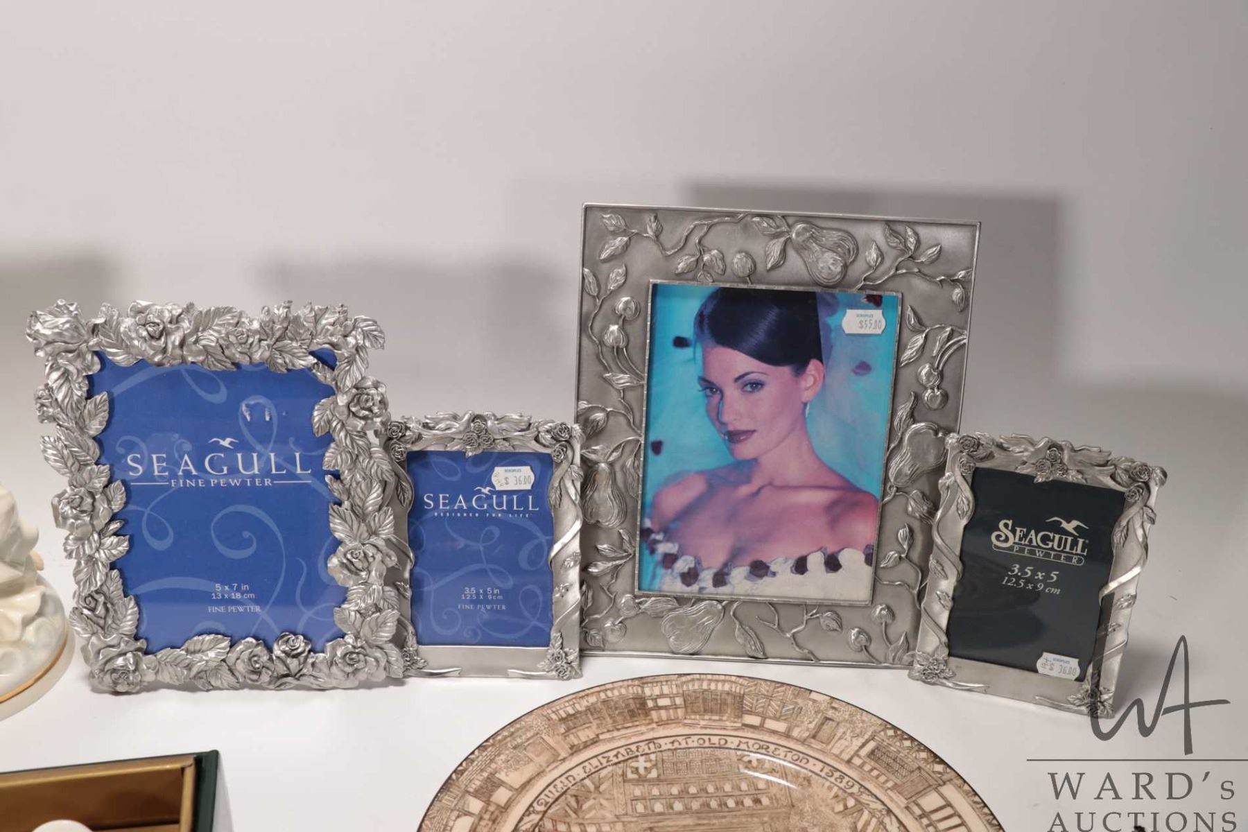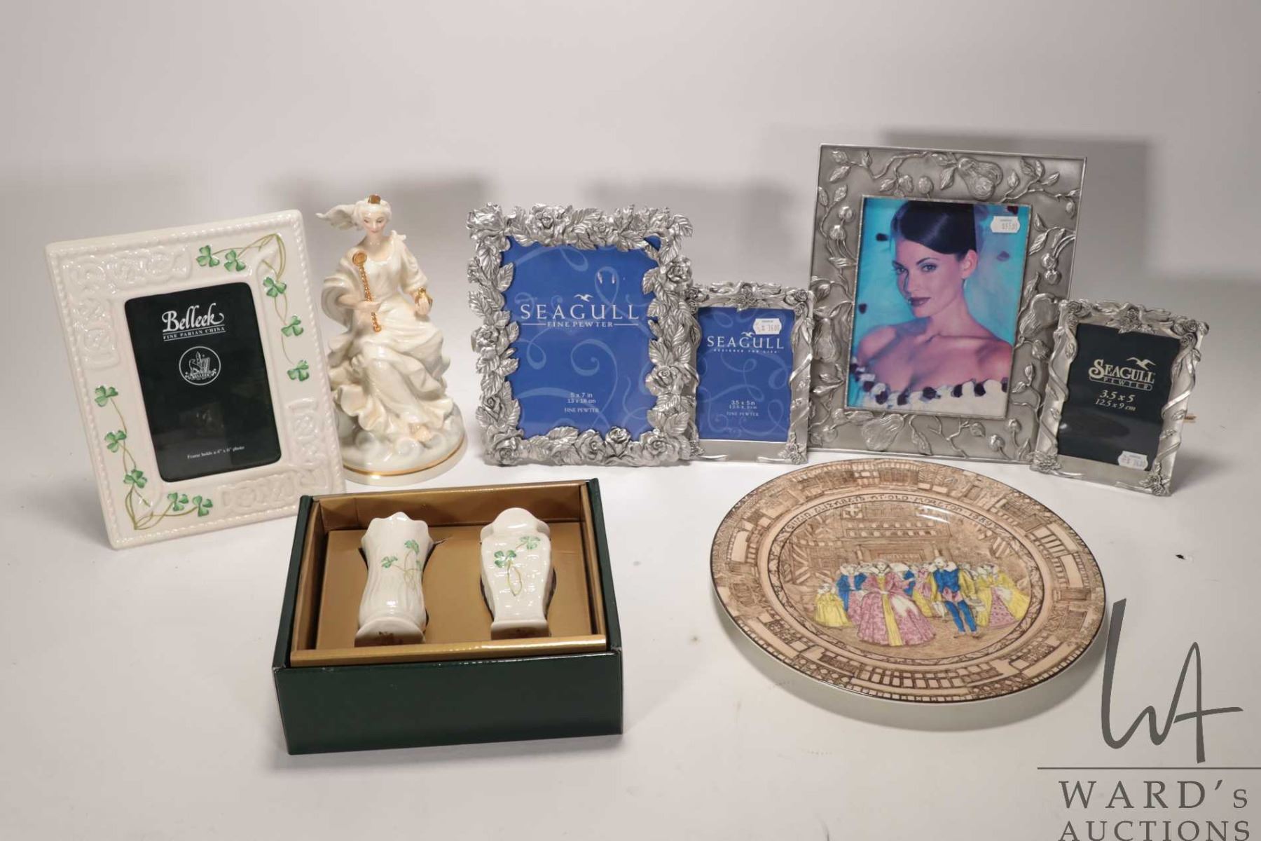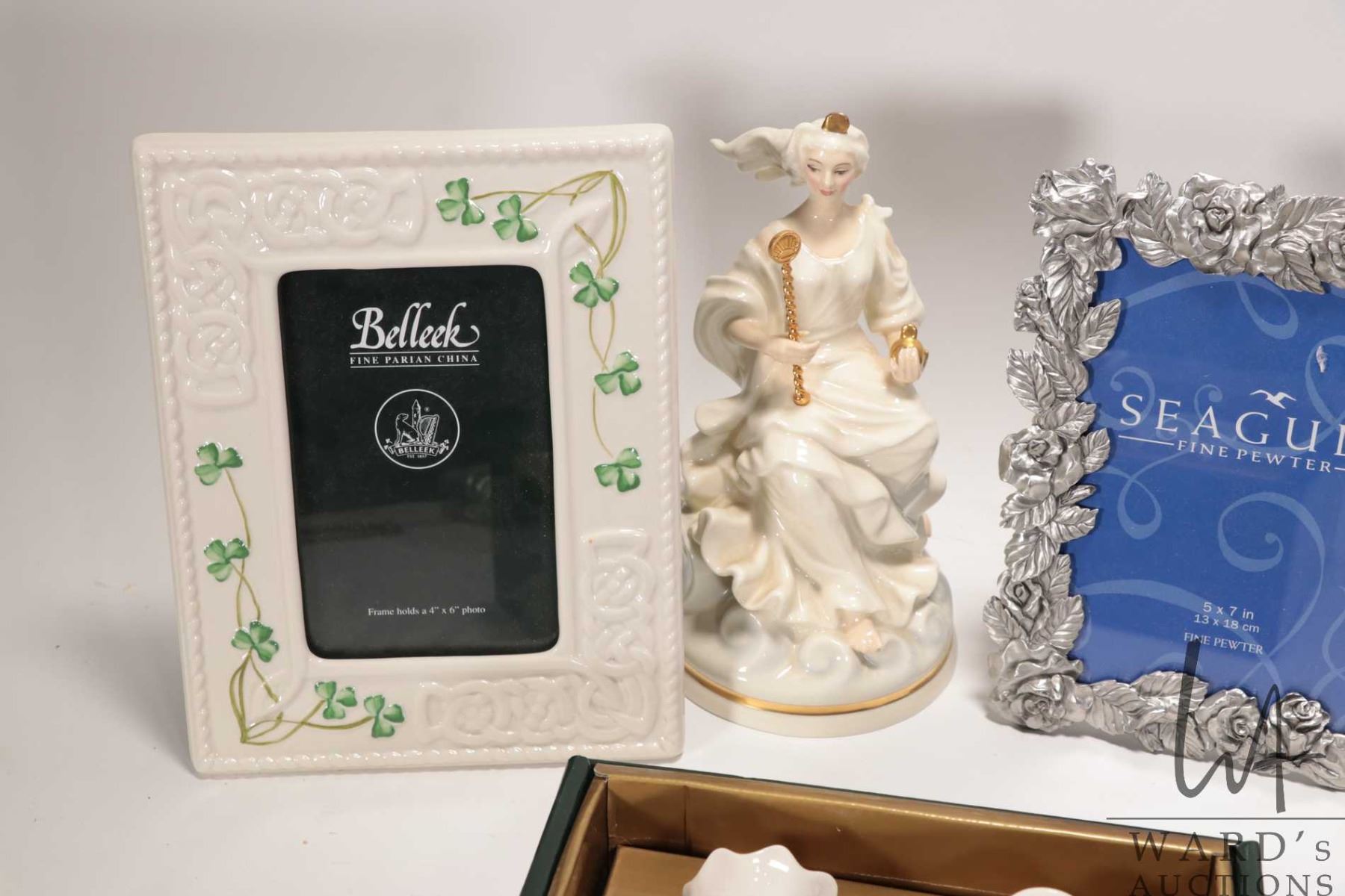 Two tray lots of collectibles including Belleek and Seagull Pewter picture frames, boxed set of mini