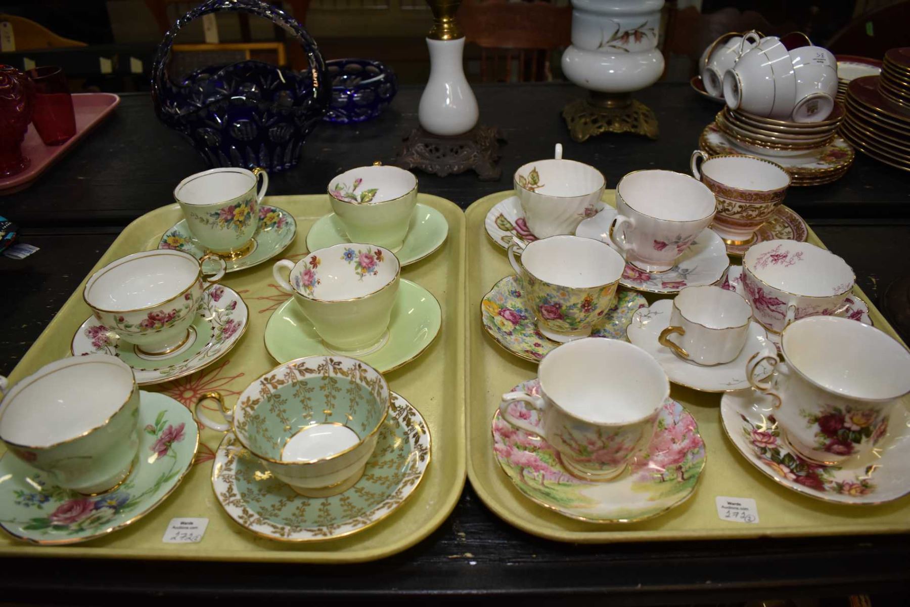 Two trays containing fourteen china cups and saucers including Windsor, Aynsley, Paragon, Royal Albe