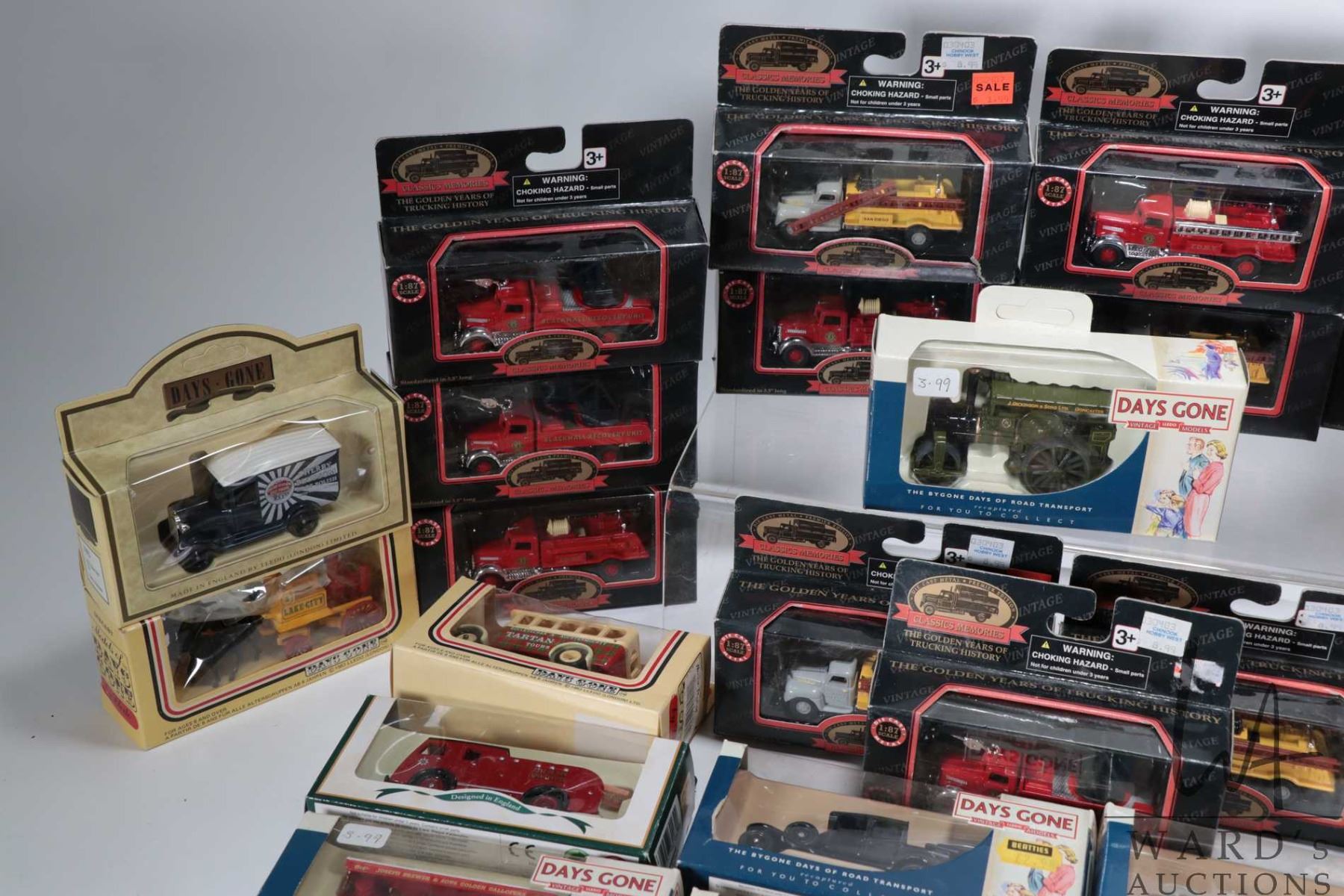 Two trays of collectible toys including one with twenty five count "Days Gone By" die cast vehicles and nineteen count of "Classic Memories" fire related vehicles