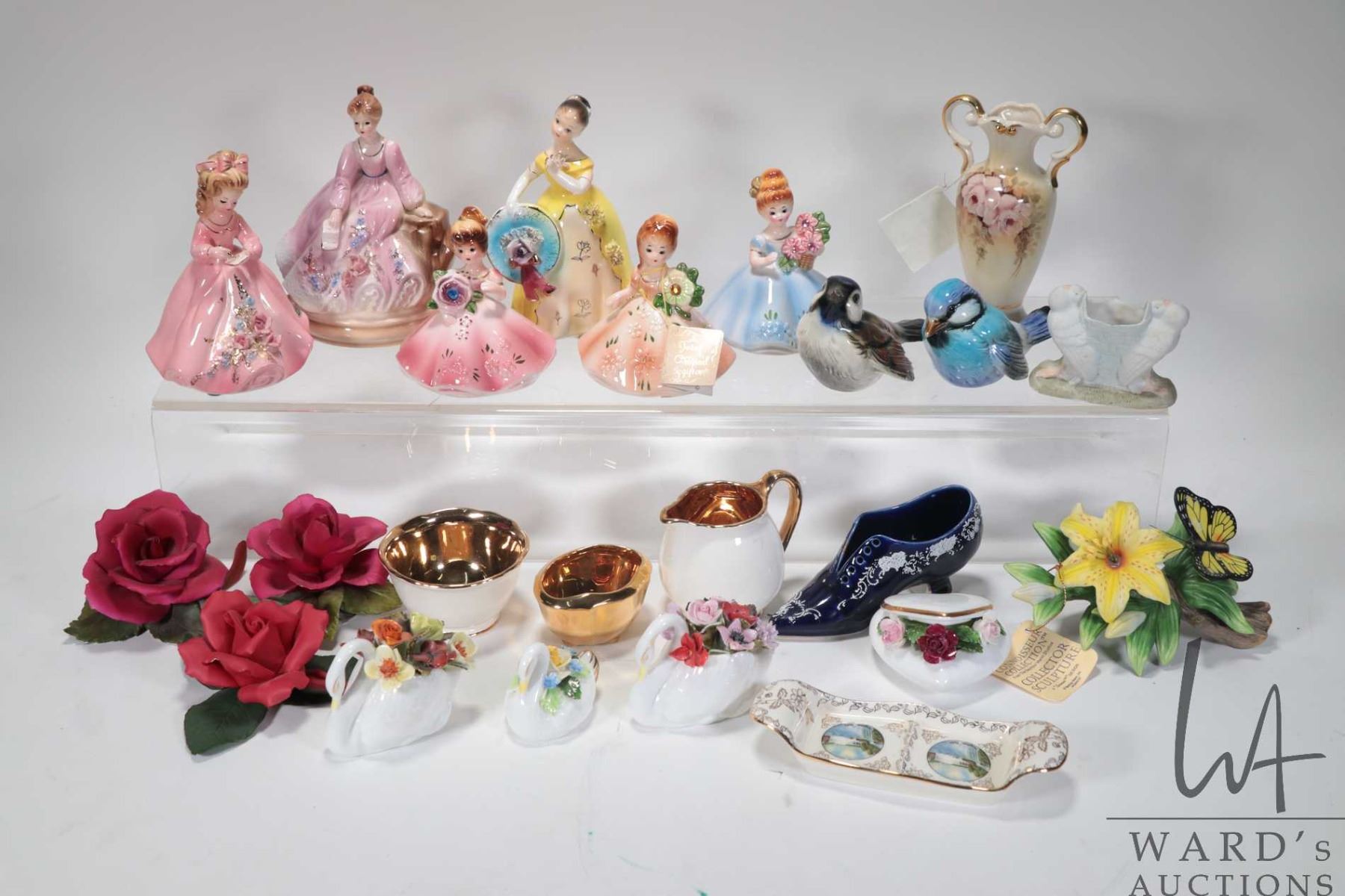 Two trays of collectibles including Josep Originals figurines, two Goebel birds, bisque roses, Crown Devon cream and sugar etc. Note: Not available for shipping. Local pickup only