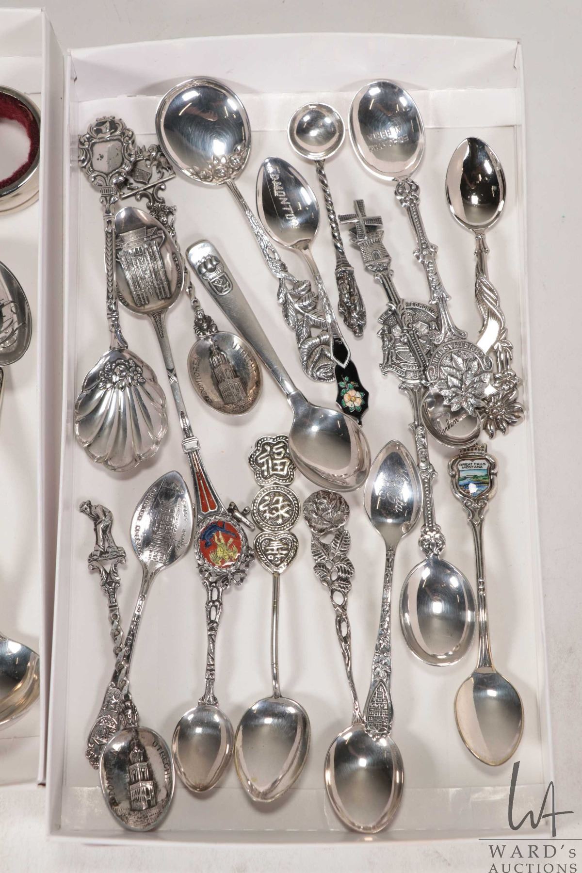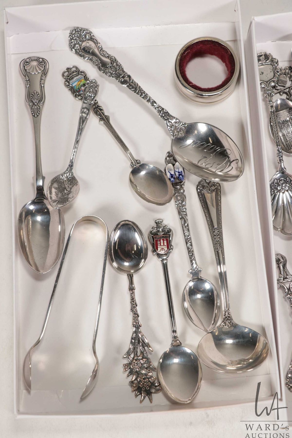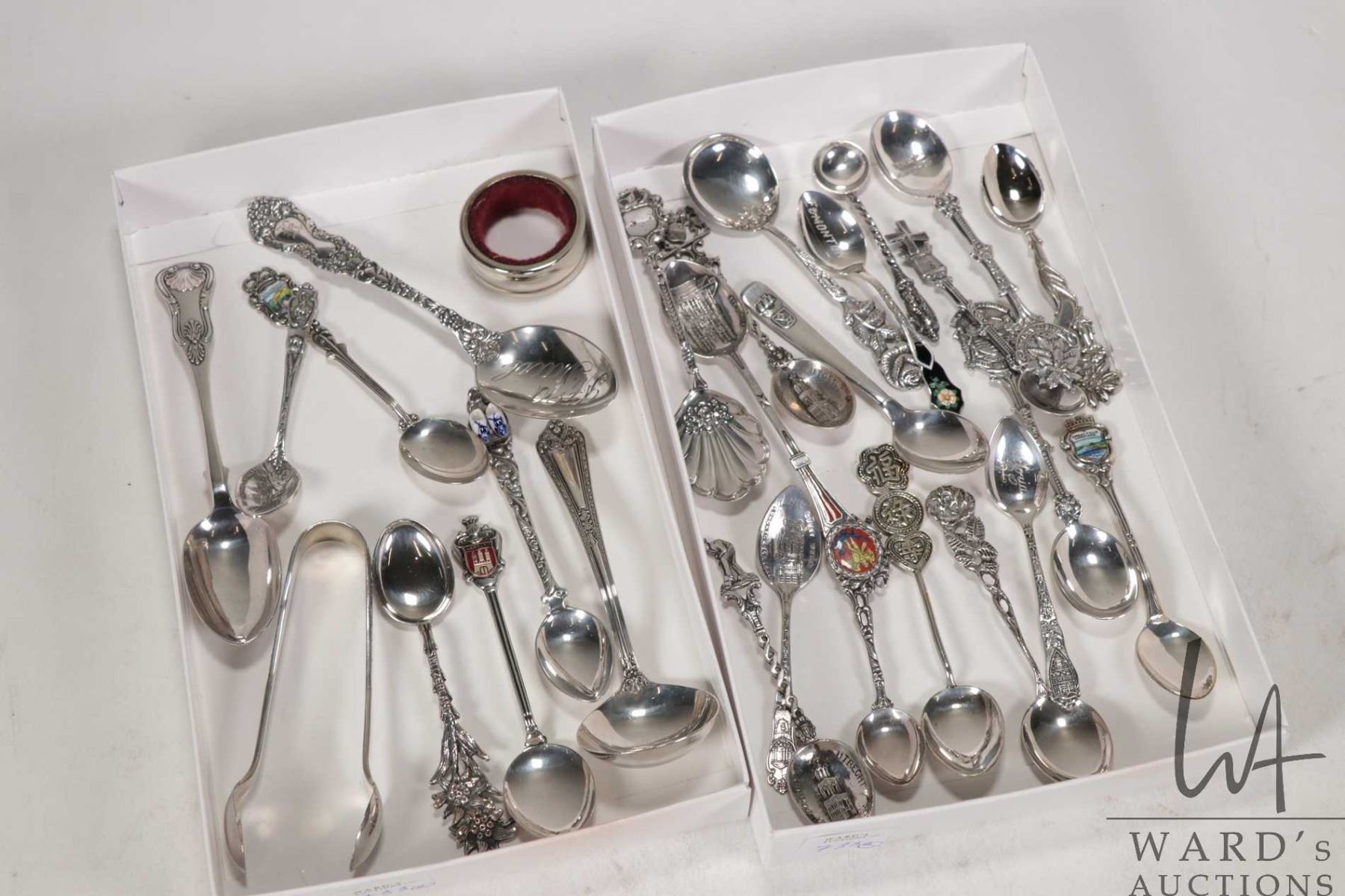 Two trays of sterling silver and silverplate collectible spoons and a set of hallmarked sugar tongs
