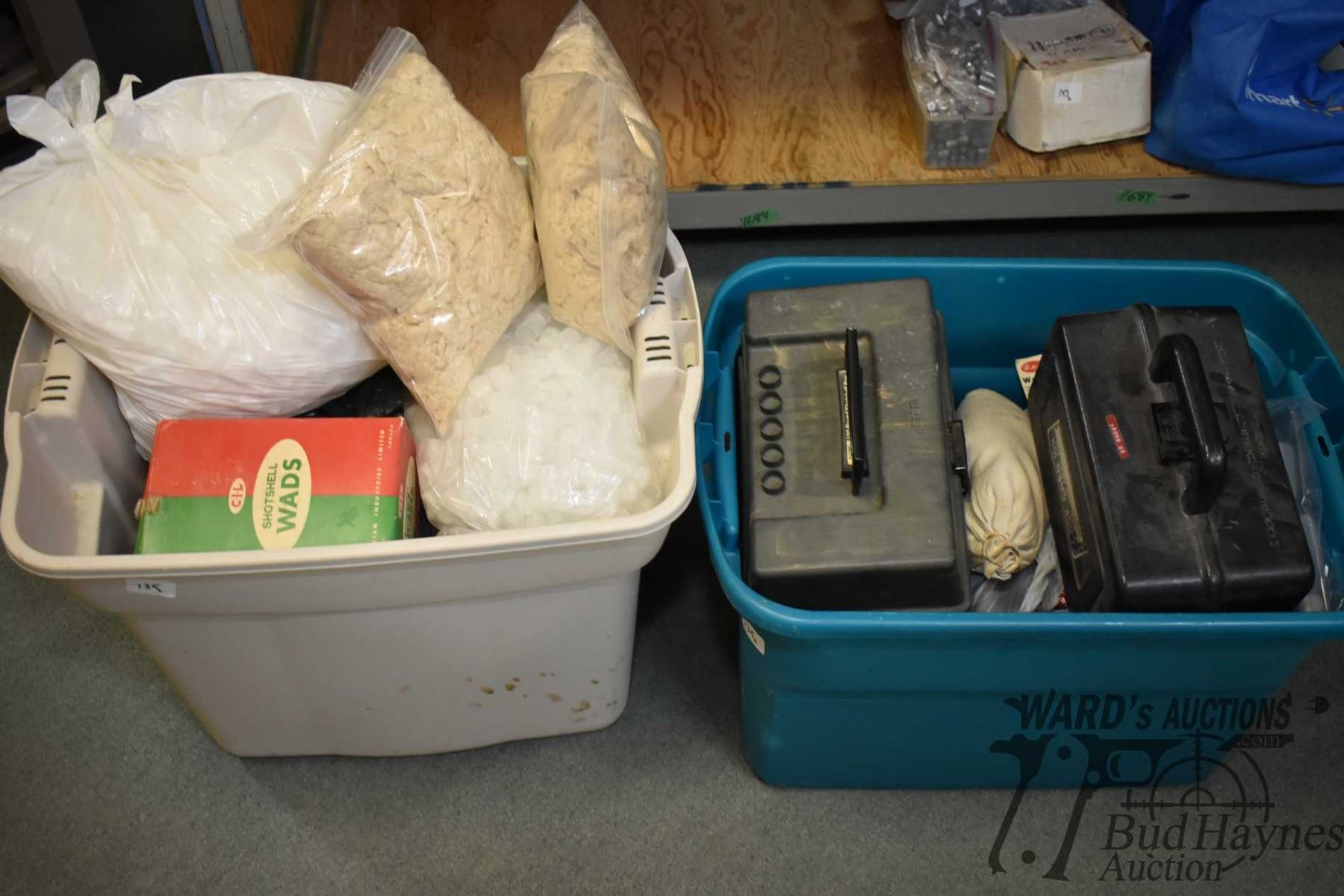 Two tubs of shot shell loading accessories Two tubs of shot shell loading accessories including wads, wad sorters, cases, 12 GA shells, etc