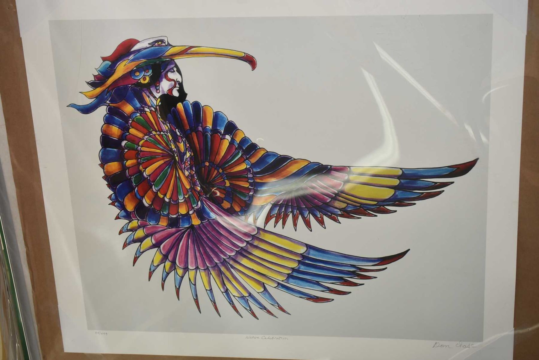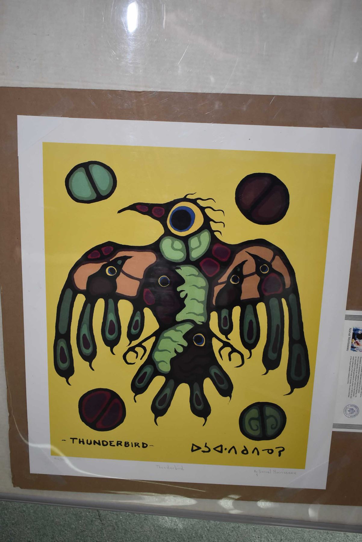 Two unframed limited edition prints including "Native Celebration" by Don Chase 84/999 and "Thunderbird" by Norval Morriseau 214/950
