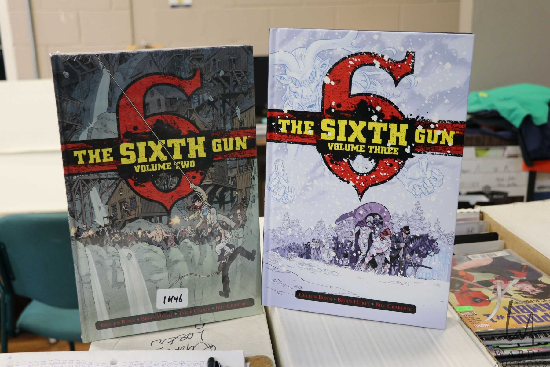 Two unopened hardcover books titled "The Sixth Gun volume 2" and "The Sixth Gun volume 3". Important: Pickup is in Edmonton. Long comic boxes (28 x 8 x 11.5 and 23kg) will be shipped in 2 boxes approximately 11 x 9 x 12 and 13kg each through Canada Post. Long boxes can be palletized for large invoices. Details to follow