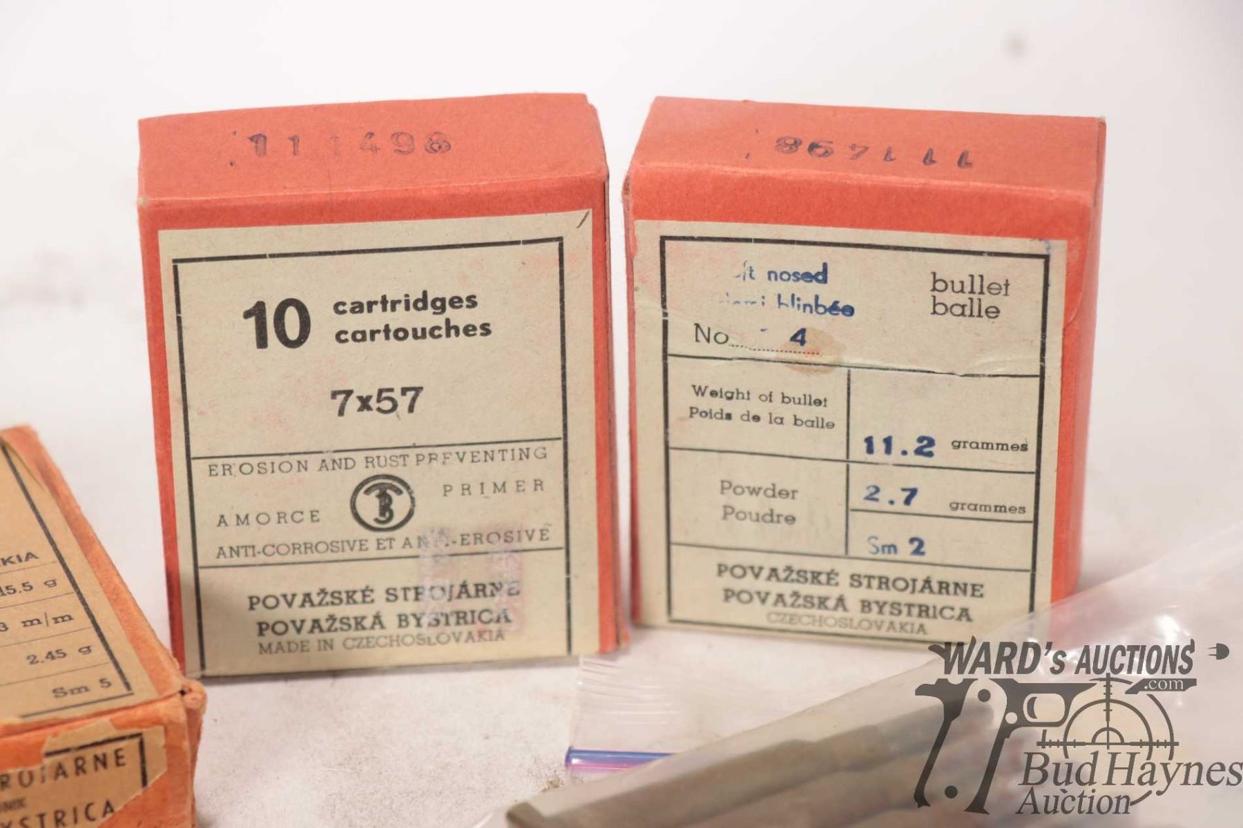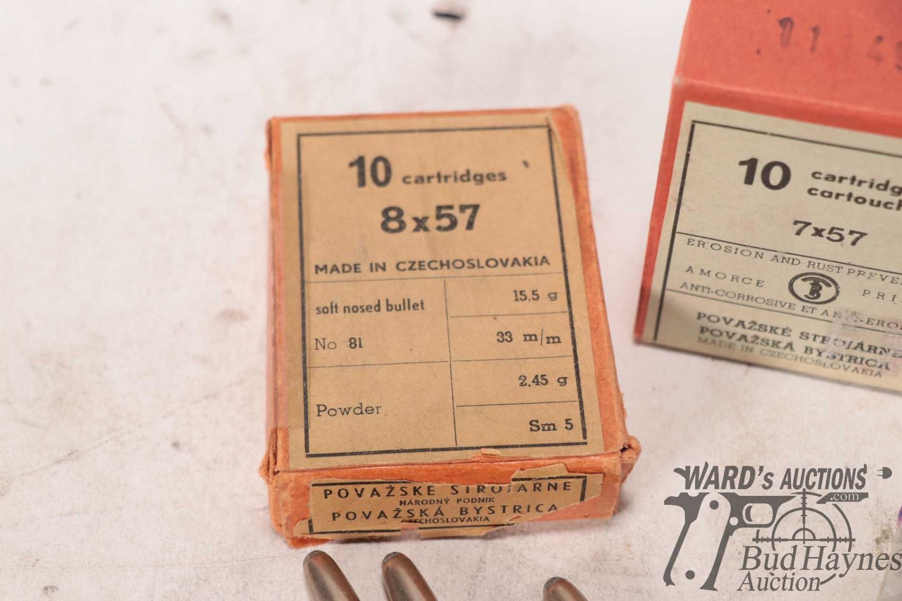 Two vintage 10 count boxes of Czechoslovakian 7 x Two vintage 10 count boxes of Czechoslovakian 7 x 57 military rounds and one vintage 8 x 57 10 count box and 4 extra rounds. Plus five 7 x 57 Mexican