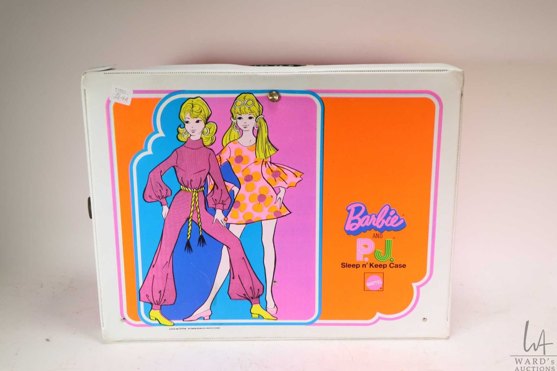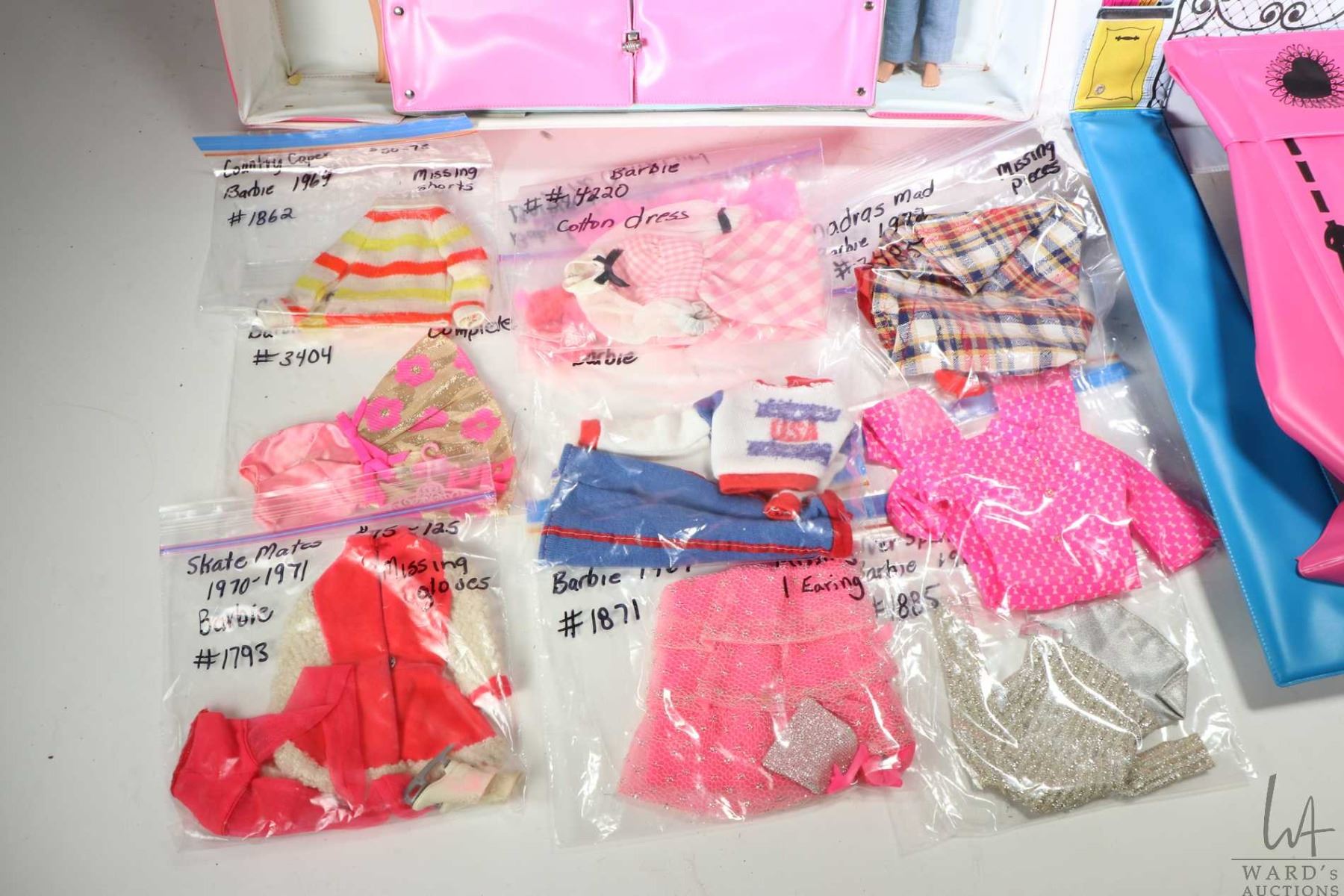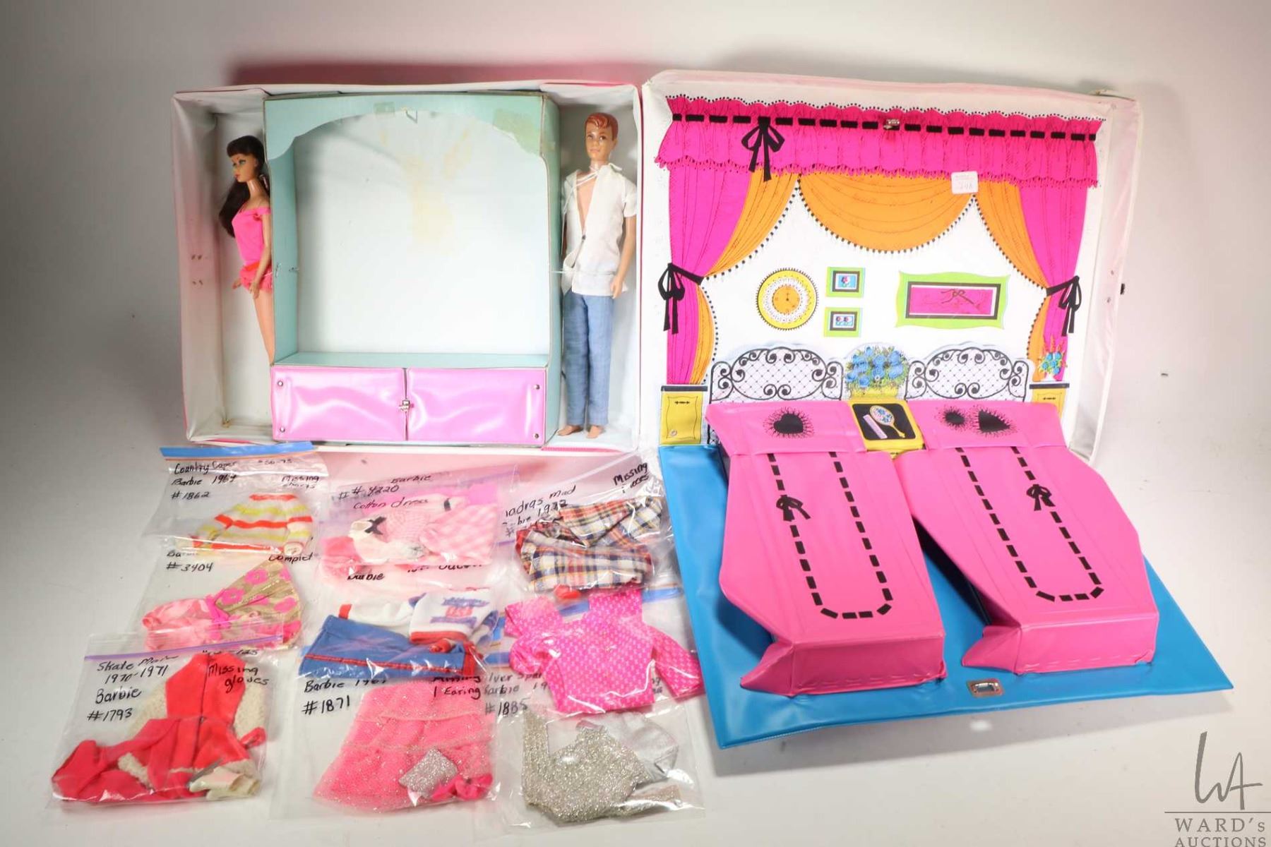 Two vintage Barbie dolls including Talking Barbie and Allen plus a selection of Barbie outfits including "Skate Mates, Country Caper, Silver Sparkle, Romantic Ruffles, Glowin Out, Baby Doll Pinks, Quick Curl Barbie cotton dress, Barbie USA outfit, Madras Mad" etc. note some outfits not complete, missing accessories, dolls in played with condition, includes vintage Barbie and P.J. Sleep n' Keep case