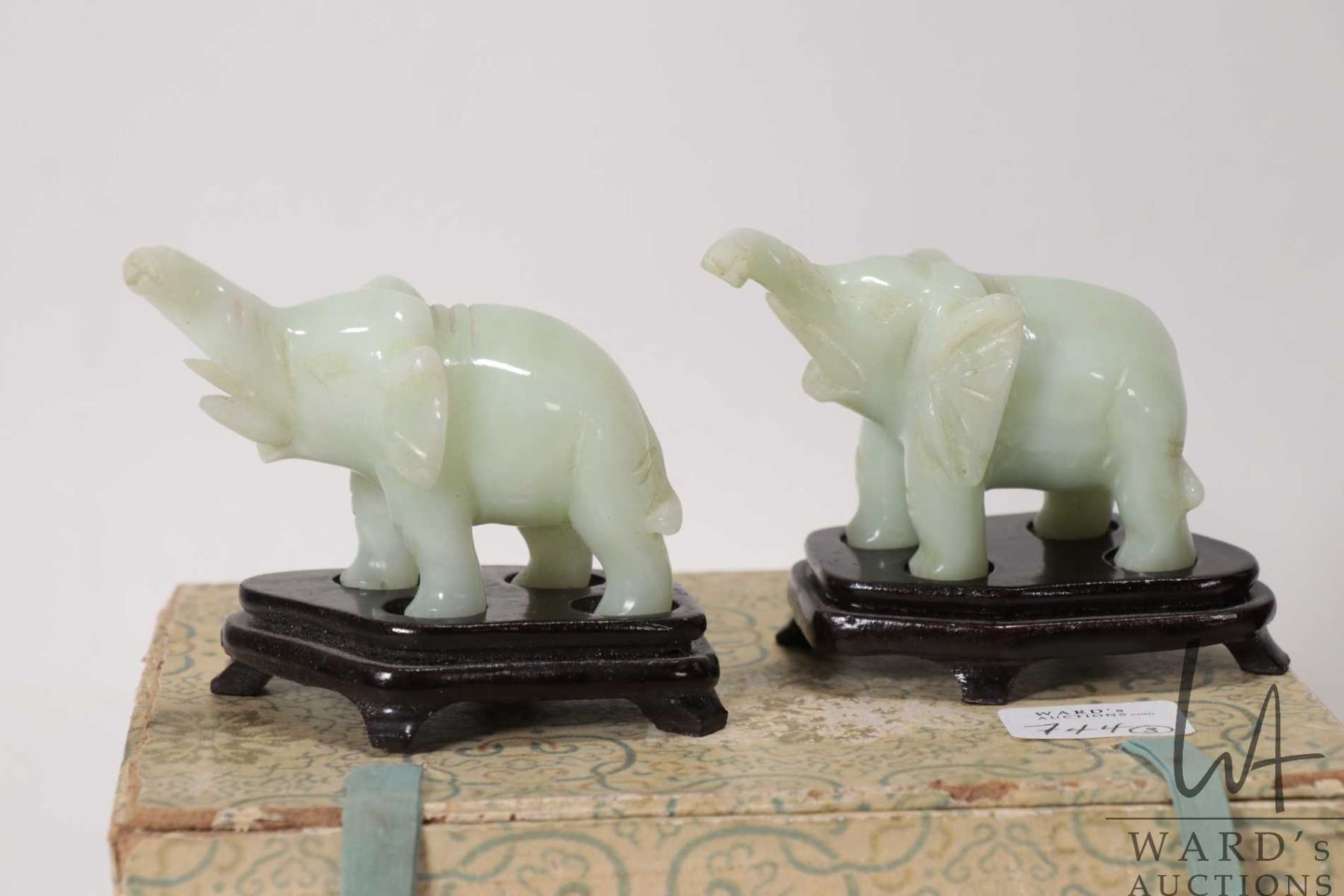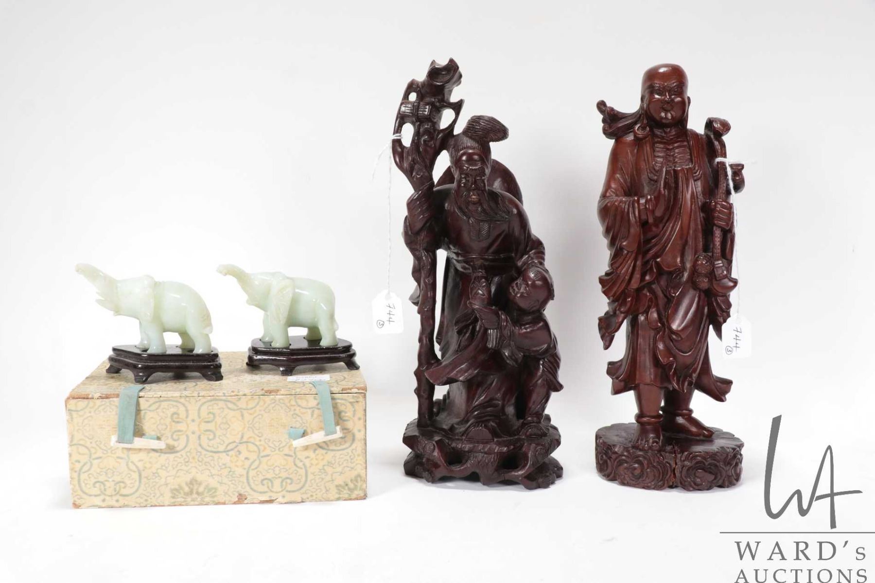 Two vintage Chinese rosewood, hand carved figures including a scholar and a diety, both approximately 10" in height plus a boxed pair of hand carved celadon elephants with wooden plinths, each a 2" in height
