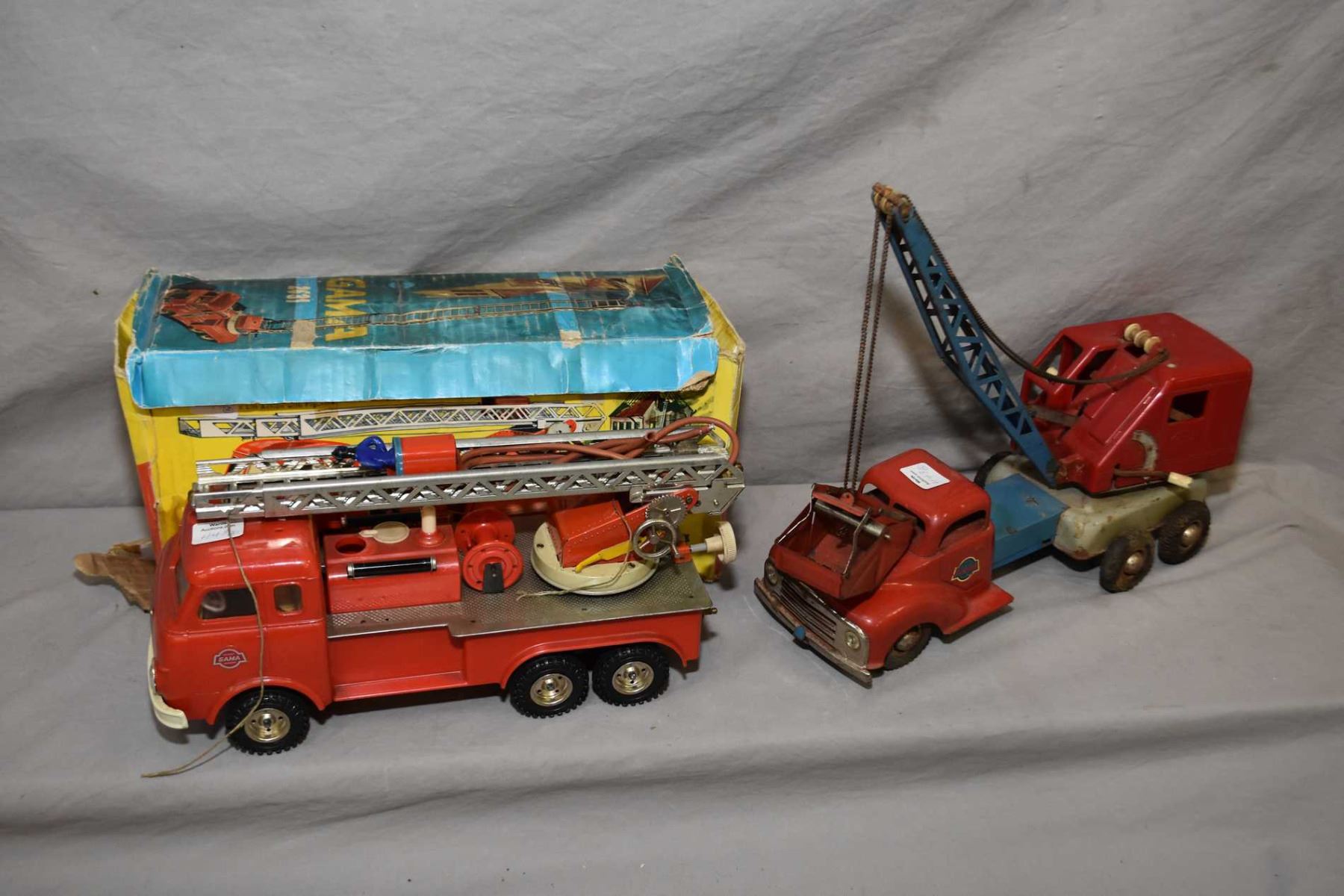 Two vintage German Gama brand tin toys including truck mounted excavator/ crane and Friction Fire engine with waterpump and original box