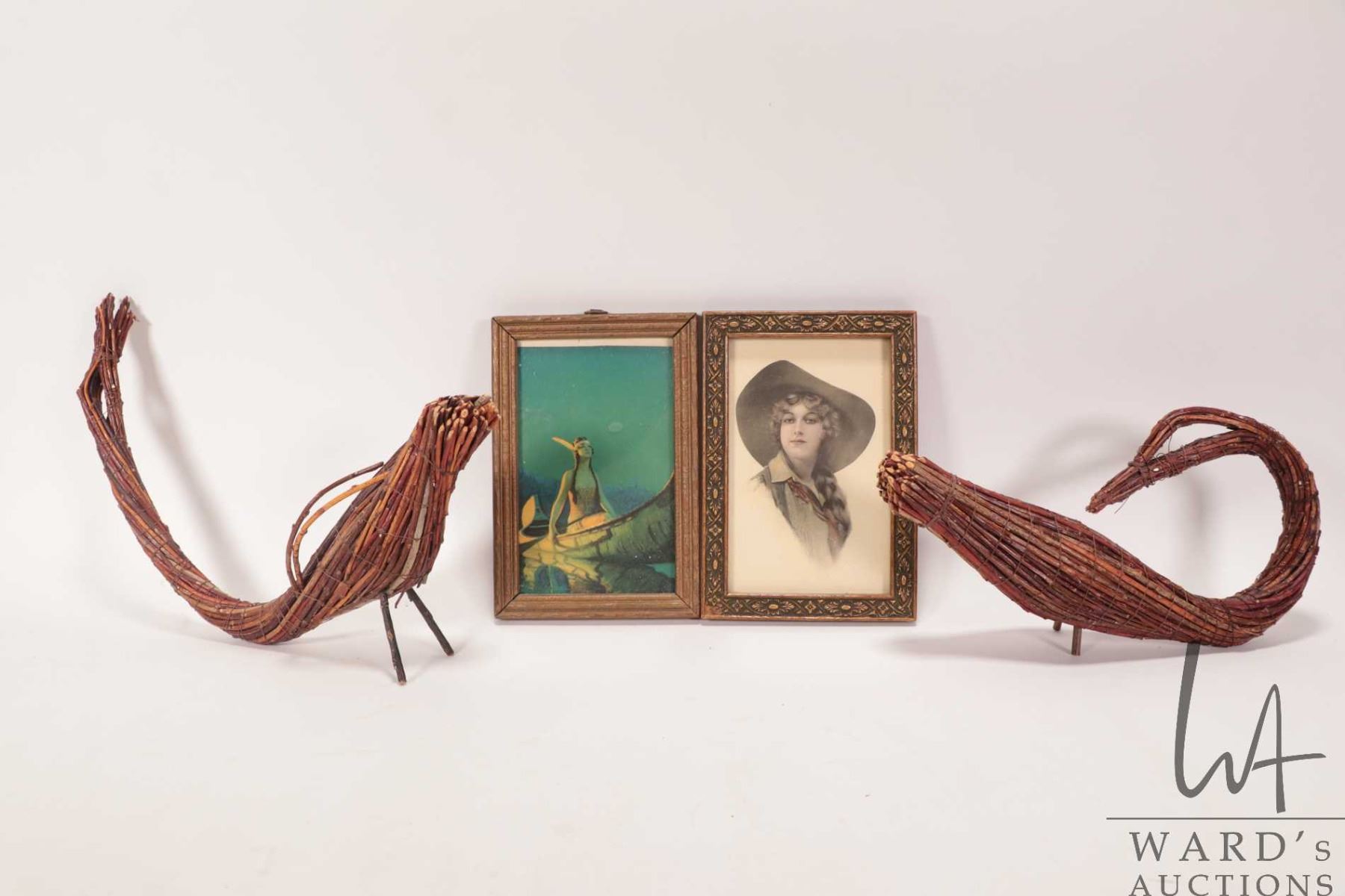 Two vintage James Bay Tamarack woven geese, vintage framed print of a maiden in a canoe and a Annie