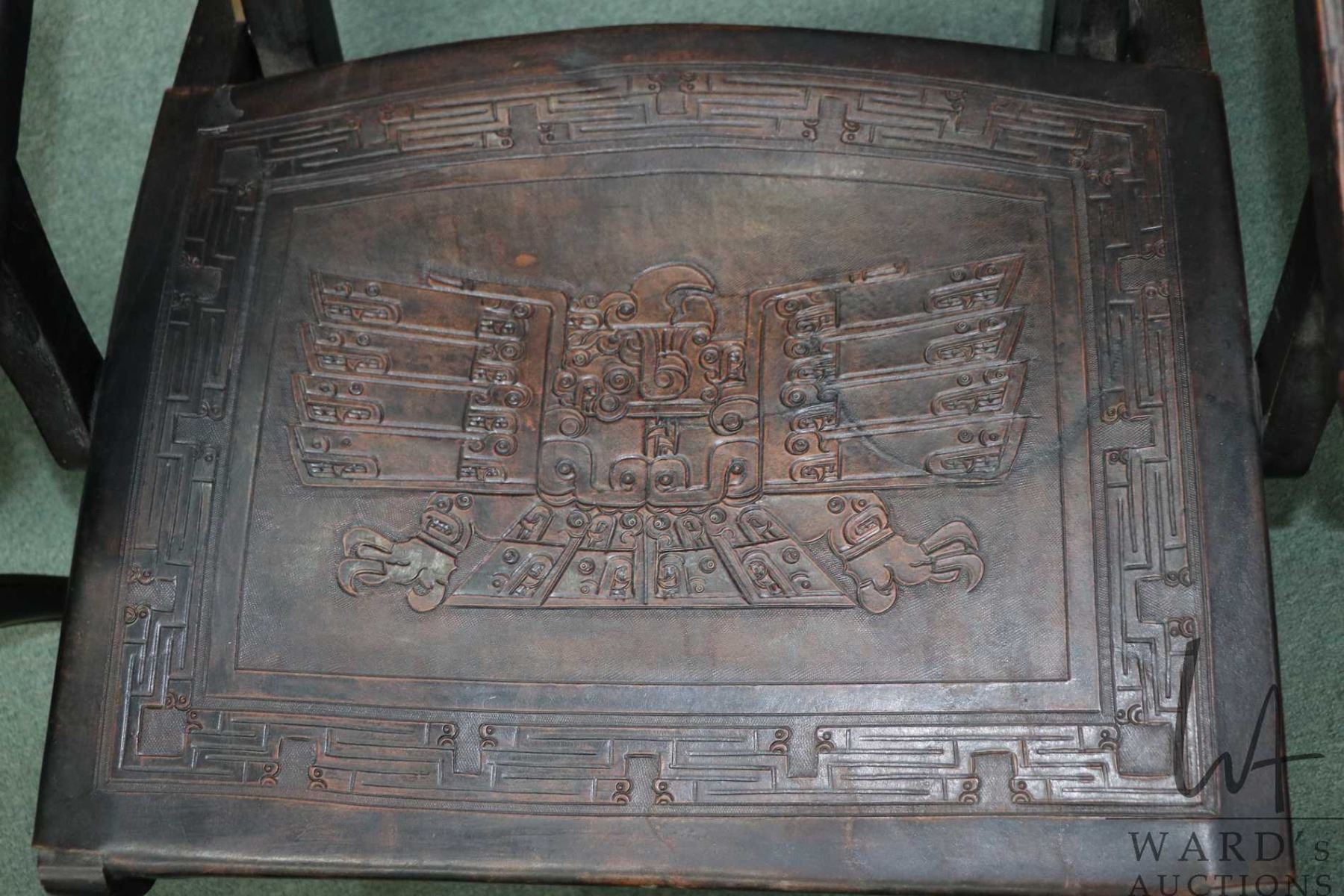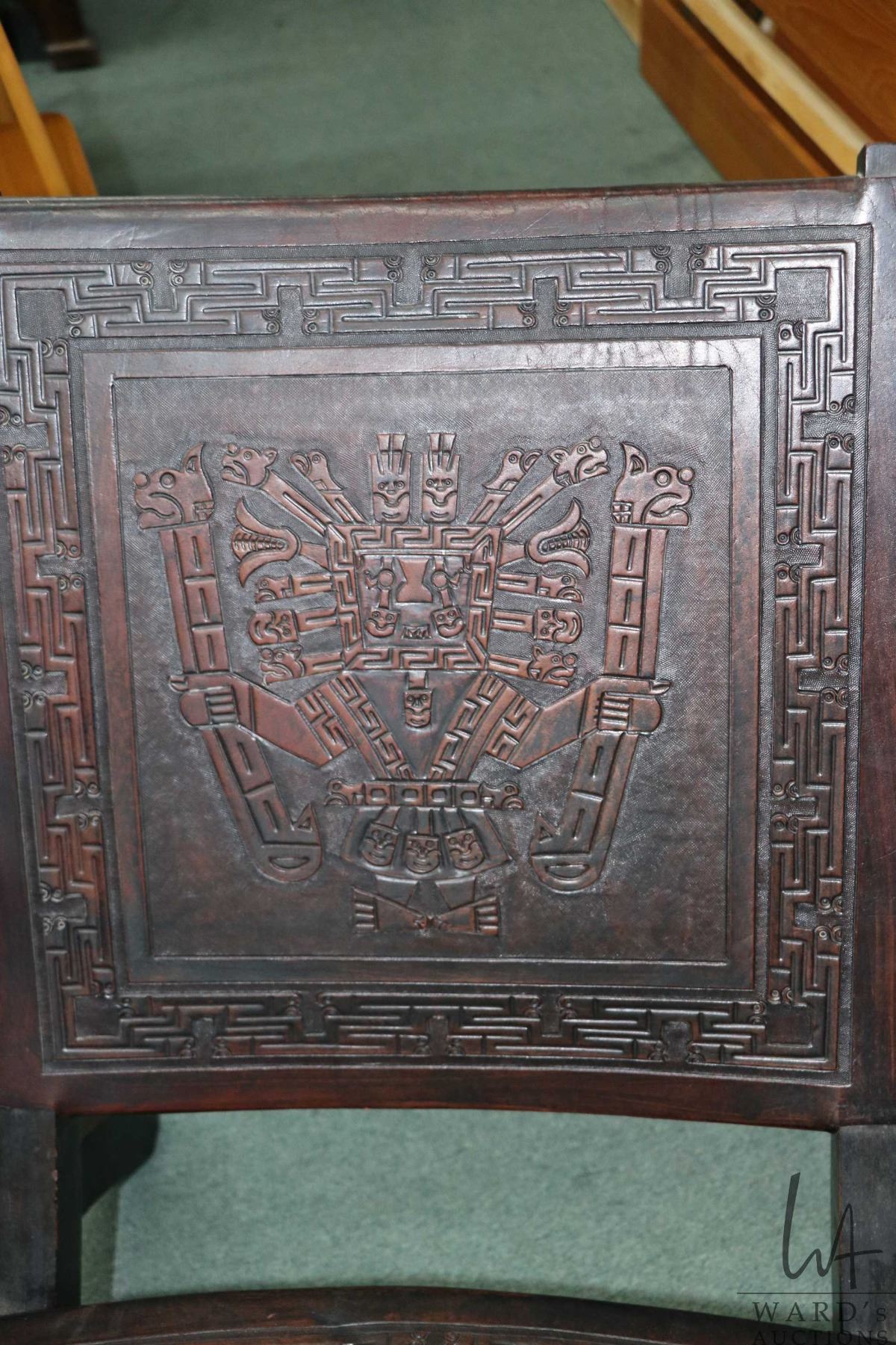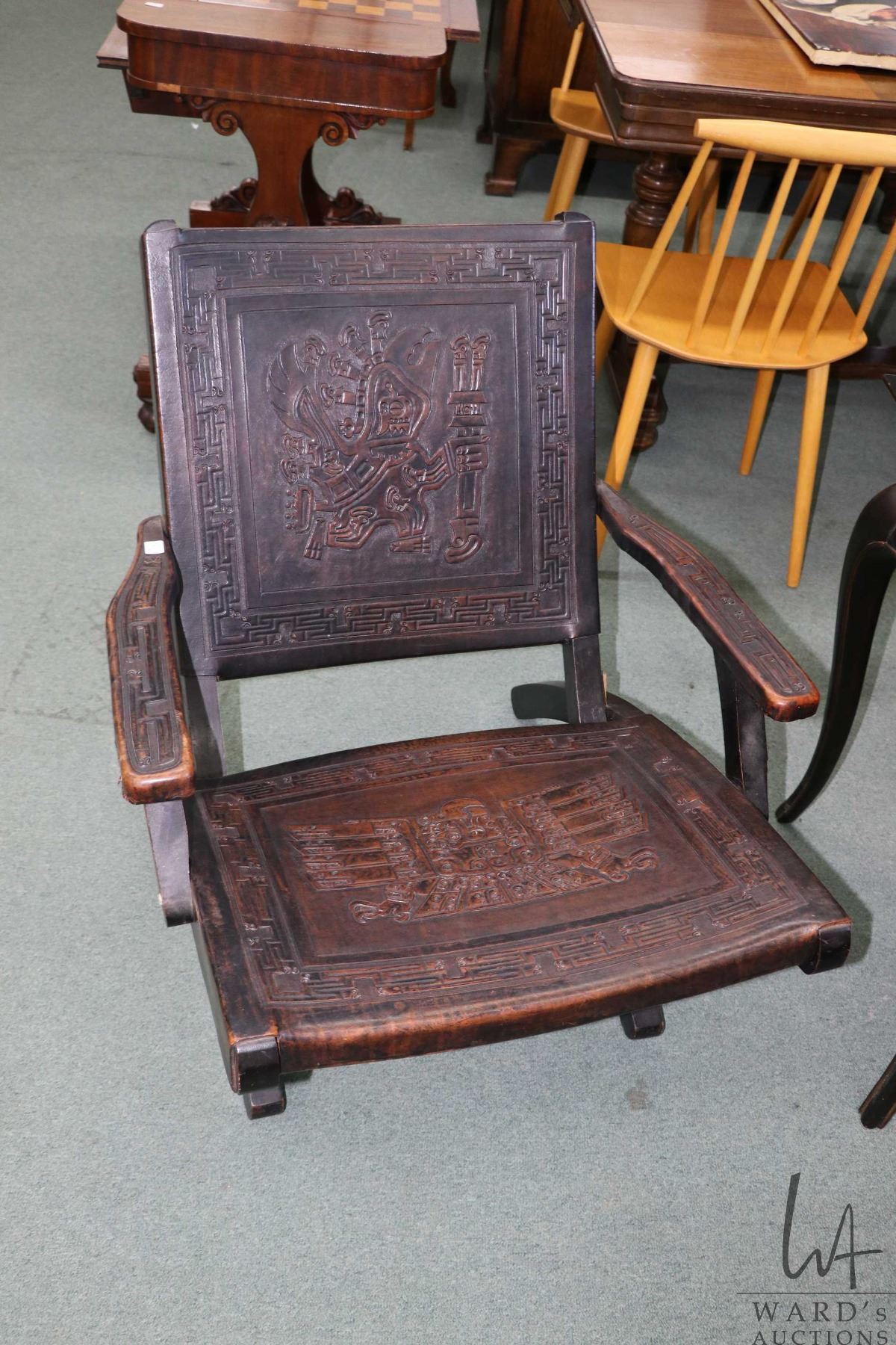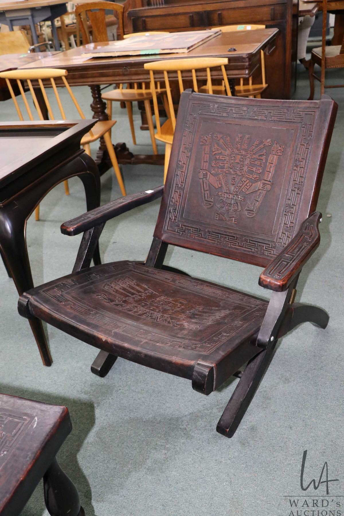 Two vintage Peruvian tooled leather and mohen wood folding chairs with decorative spiritual imagery, circa 1940