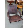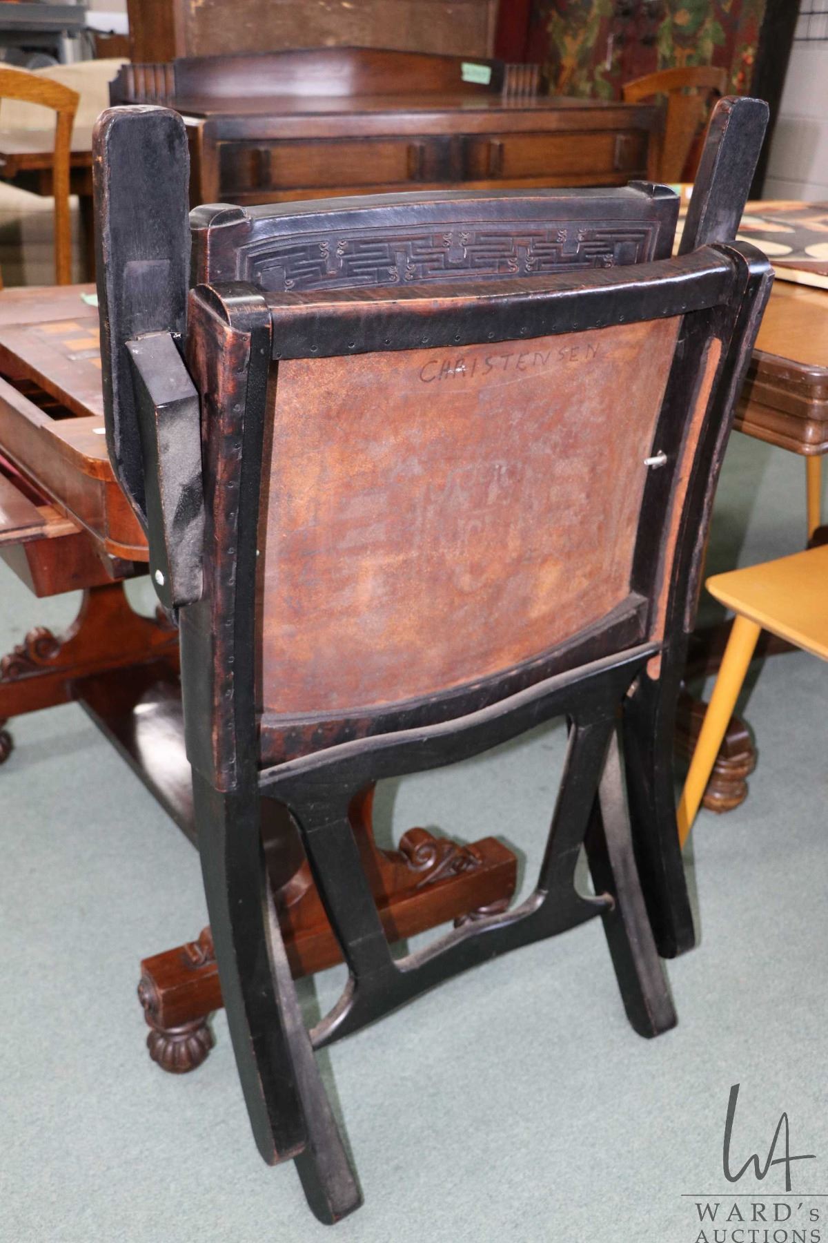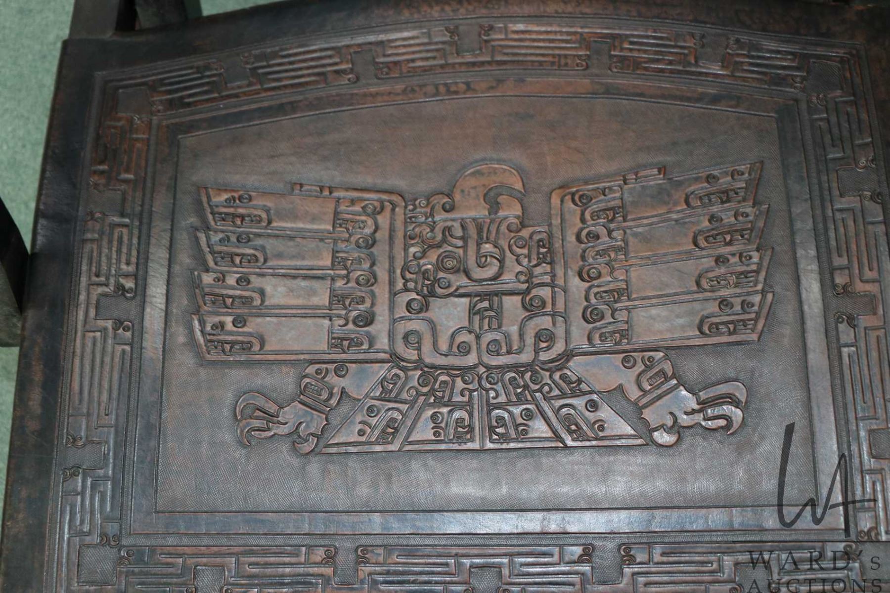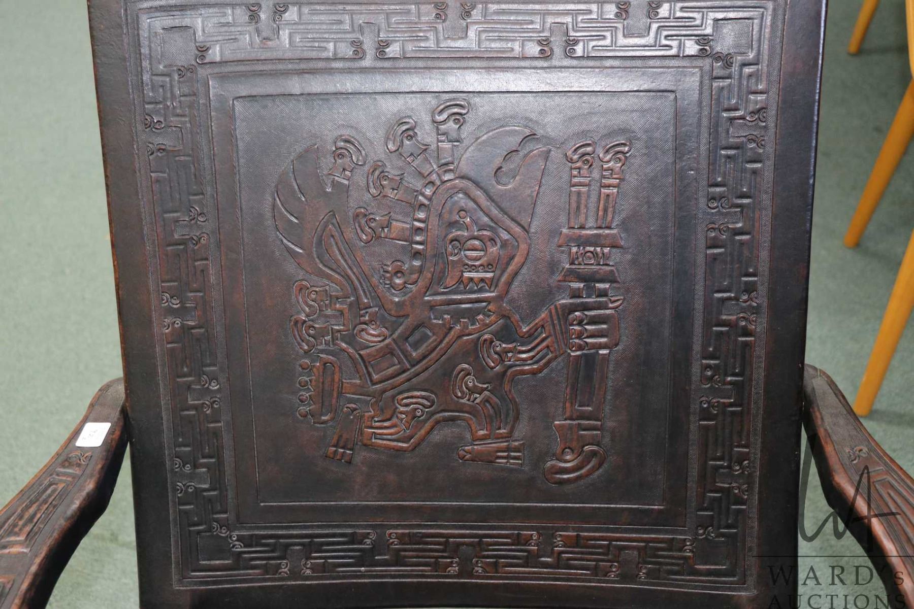 Two vintage Peruvian tooled leather and mohen wood folding chairs with decorative spiritual imagery, circa 1940