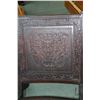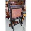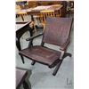 Two vintage Peruvian tooled leather and mohen wood folding chairs with decorative spiritual imagery,
