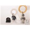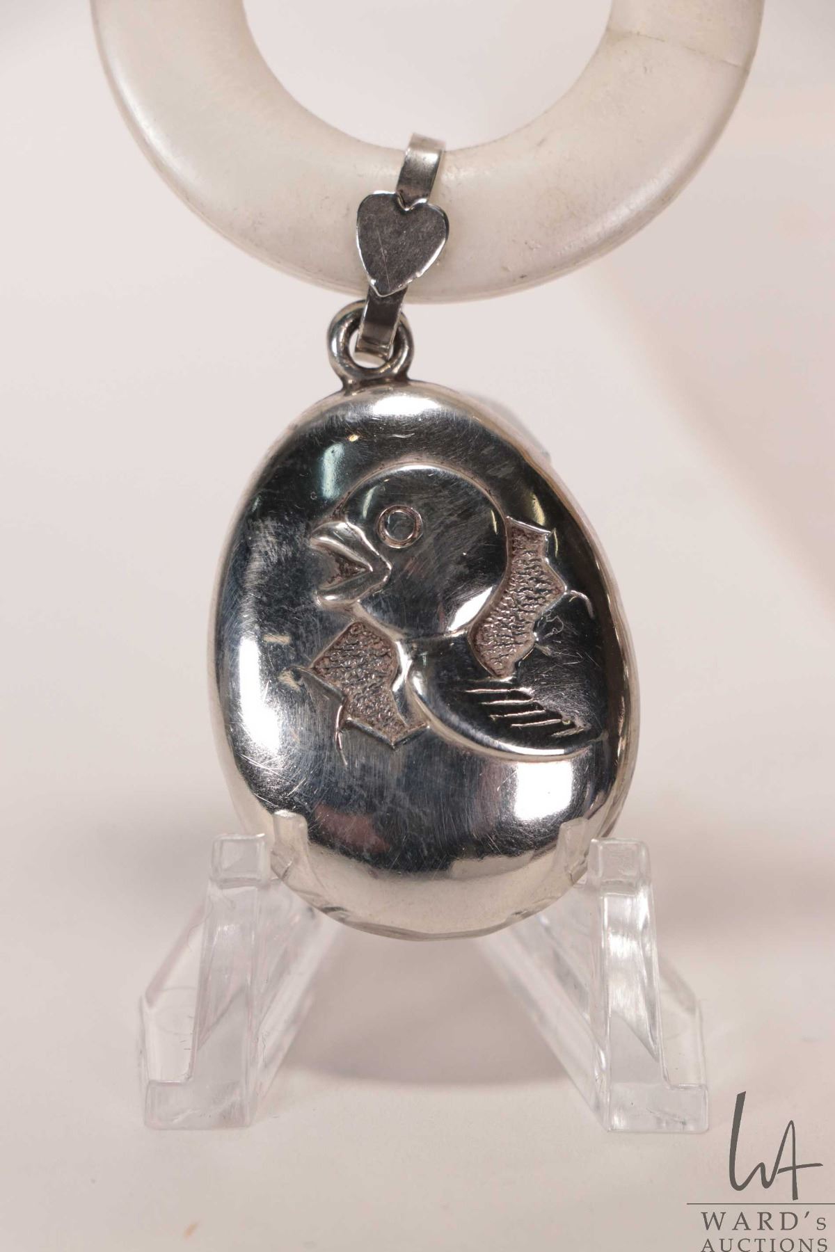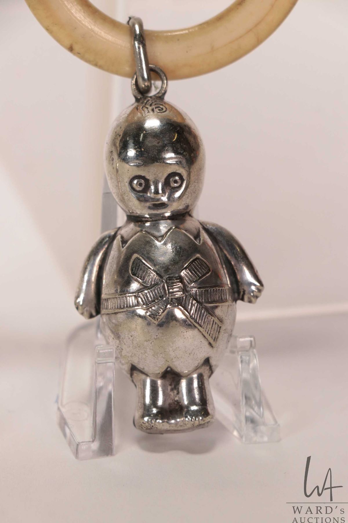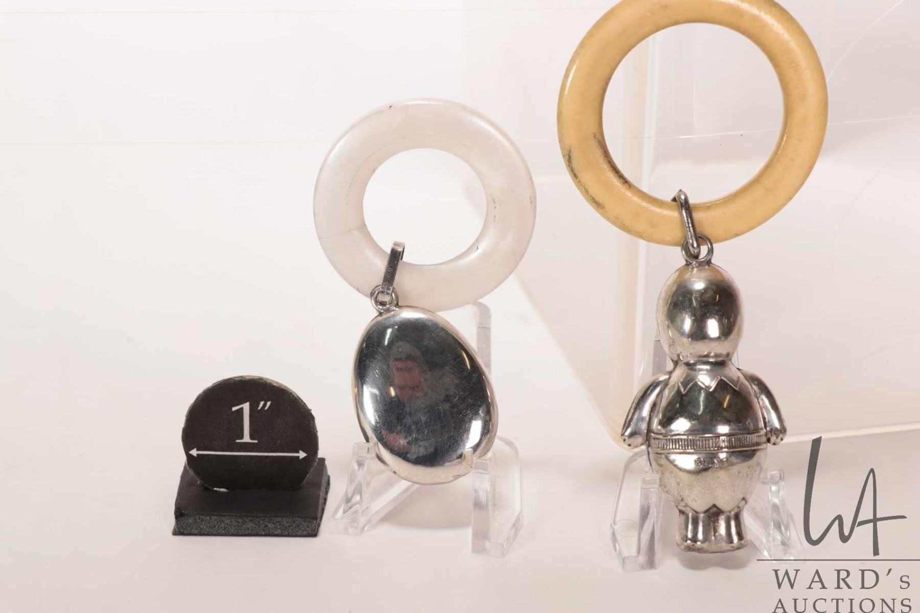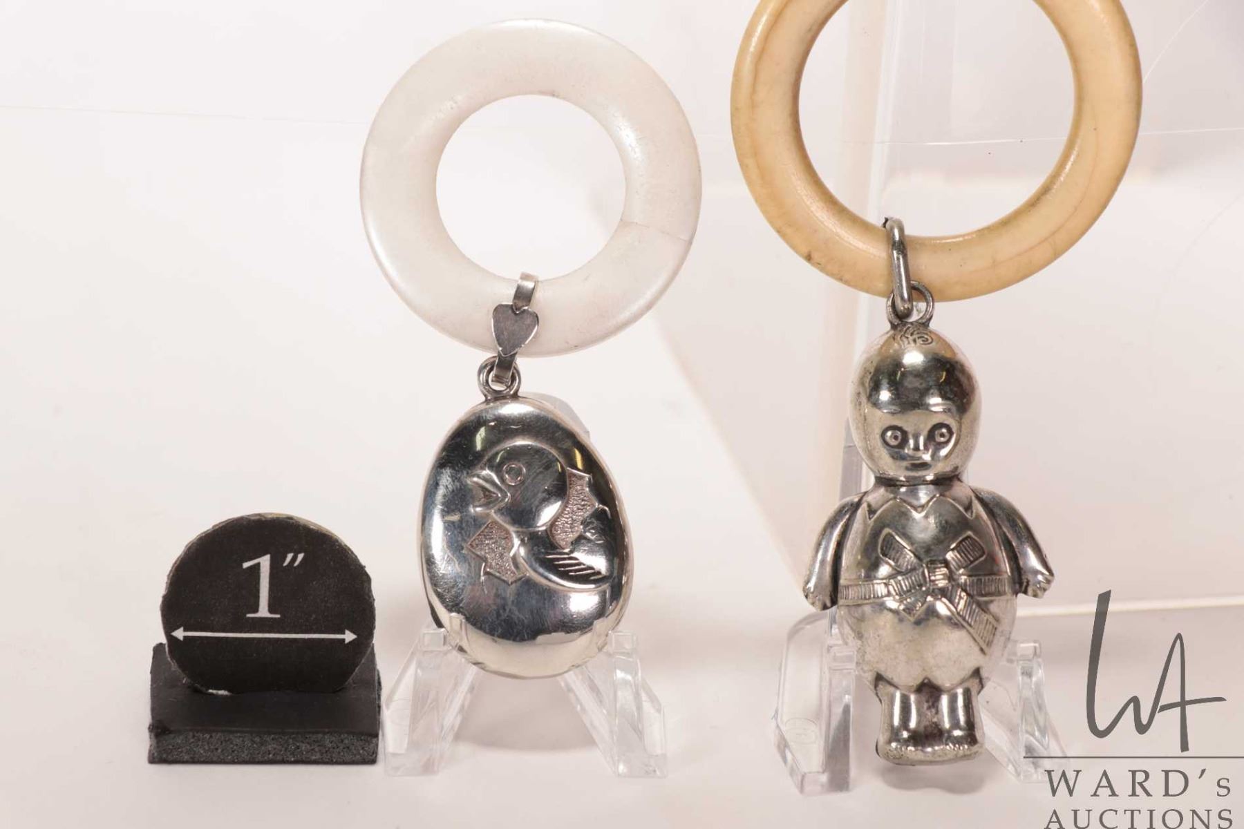 Two vintage baby rattles including baby hatching from egg, marked with British sterling hallmarks an