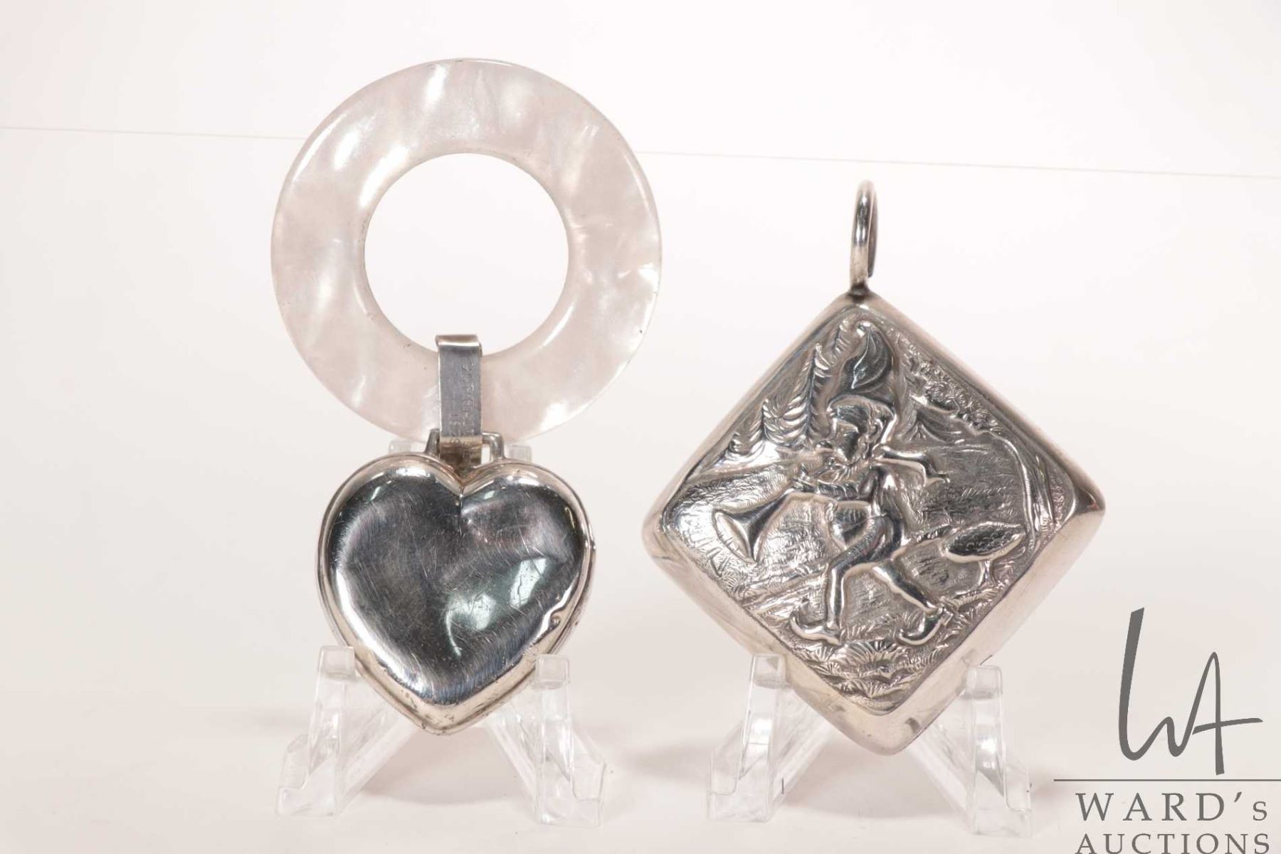 Two vintage baby toys including Brownie motif bell and heart shaped toy on mother-of-pearl/ like handle