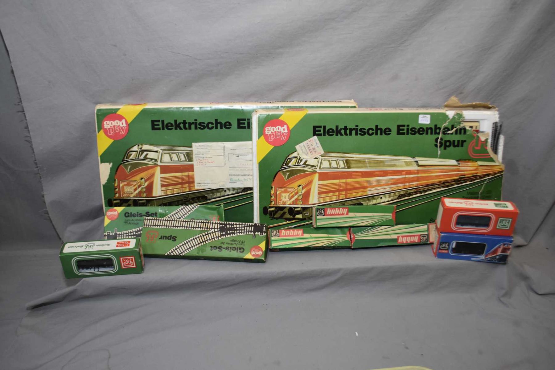 Two vintage boxed German made 1:120 scale train sets plus extra track, engine and five train cars