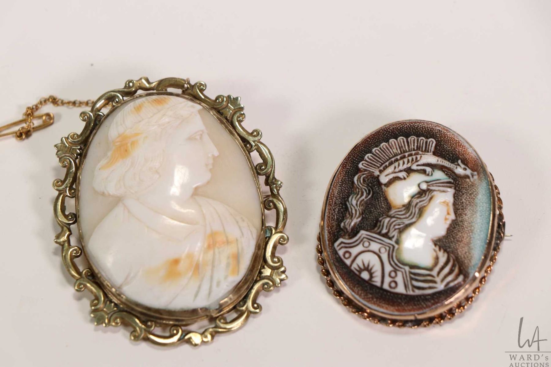 Two vintage cameos including a carved gentleman with a laurel leaf crown in brass bezel and a Roman soldier with a dragon crown, material unknown, in a gold toned/plated bezel