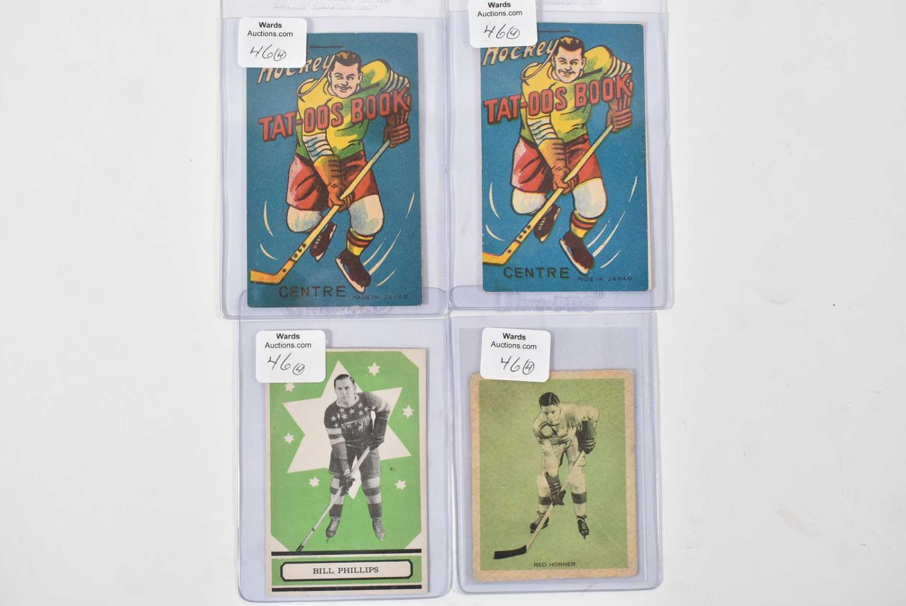 Two vintage chewing gum hockey cards including 1933 Hamilton Gum "Red Horner #21", and 1933 O-Pee-Chee "Bill Phillips" hockey card, Series A-No.43 plus two Hockey Tat-oos Books of hockey player tatoos