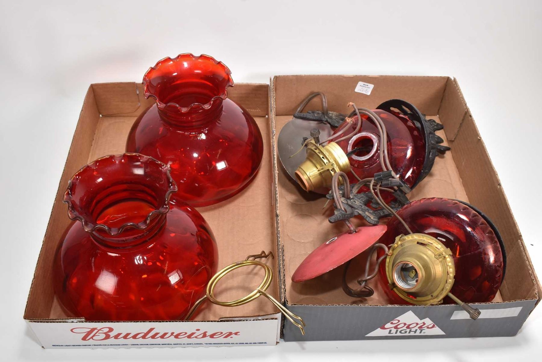 Two vintage converted to electric wall mount oil lamps with ruby glass fonts and shades, includes mounting brackets