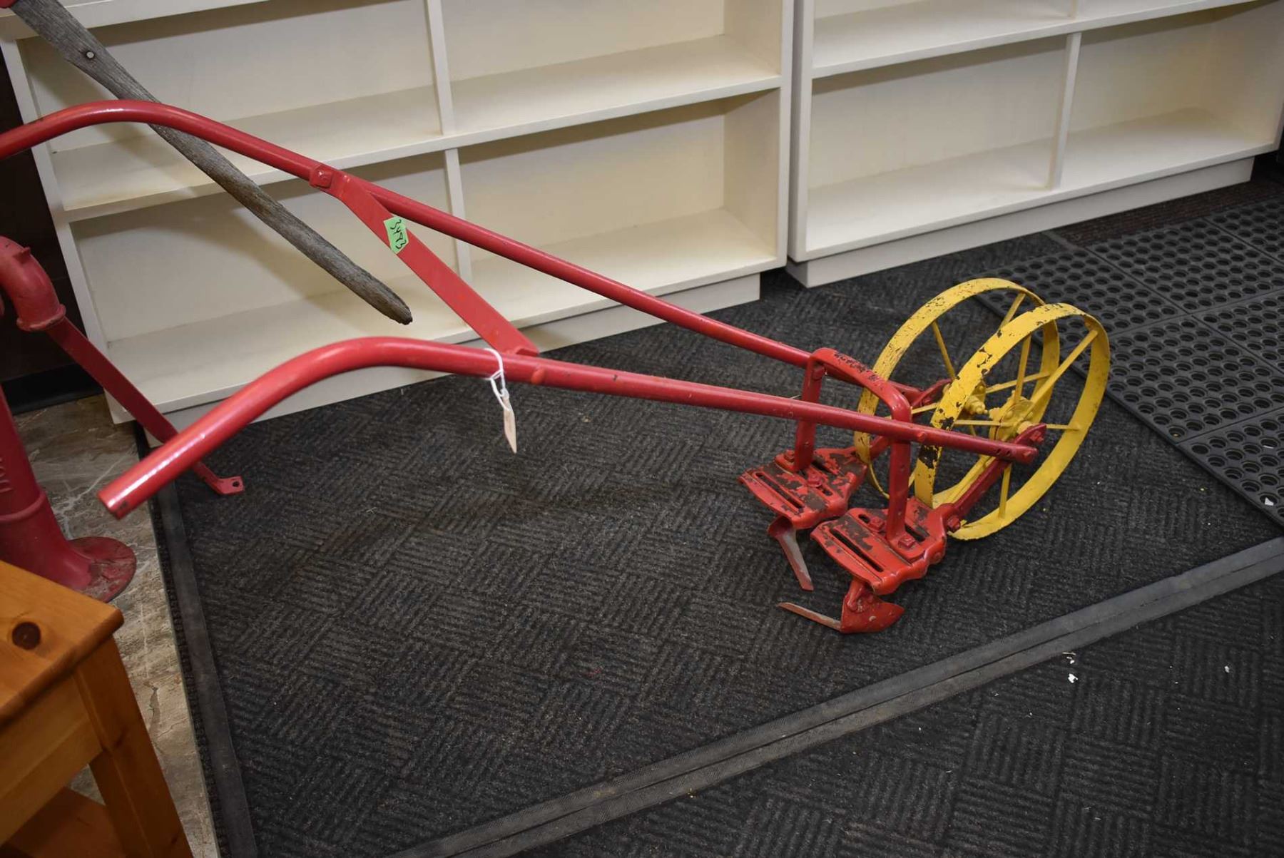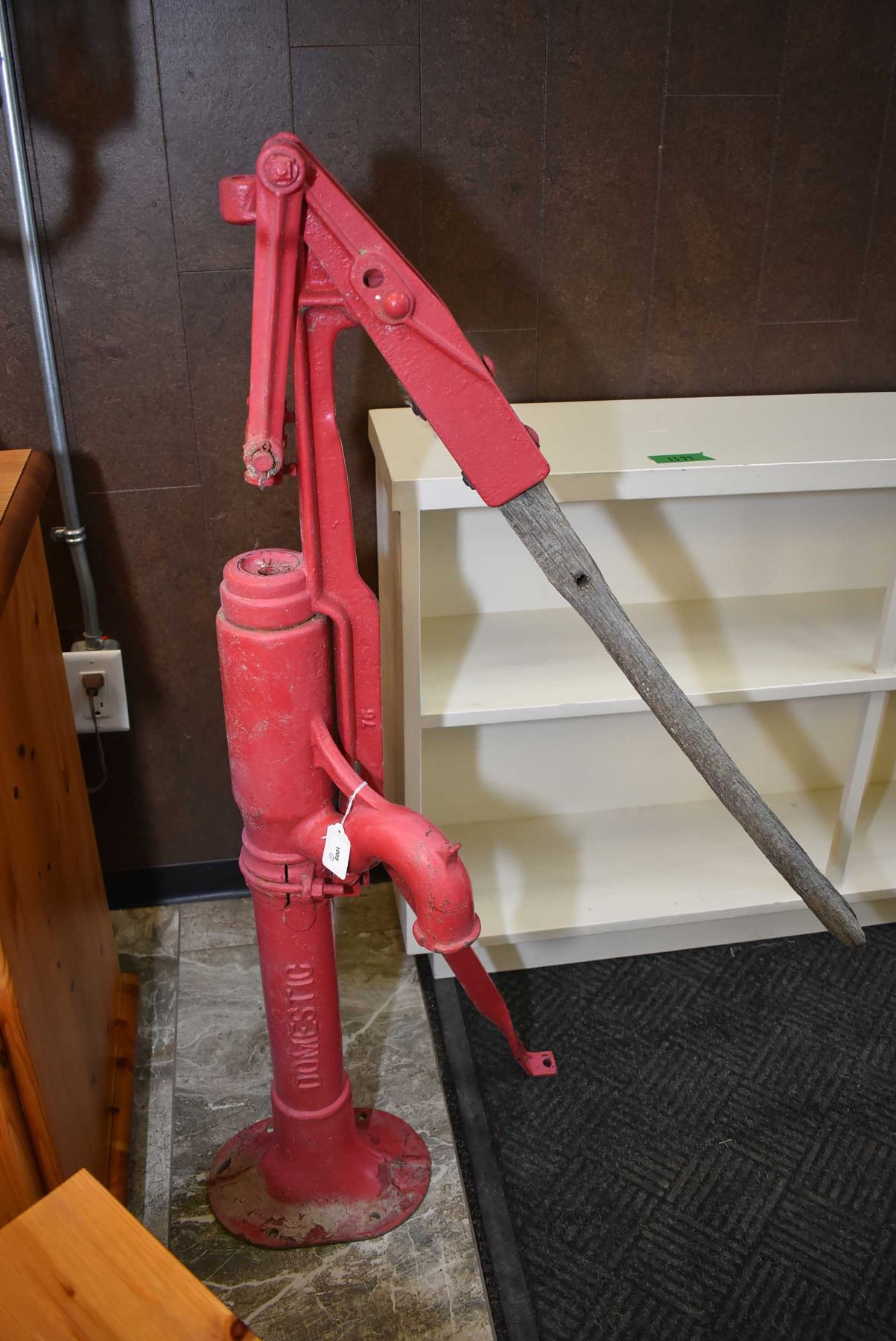 Two vintage farm tools including cast "Domestic" well hand pump with original wooden handle and a walk behind tiller