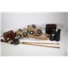Two vintage gas masks, folding ruler and two pairs of vintage binoculars