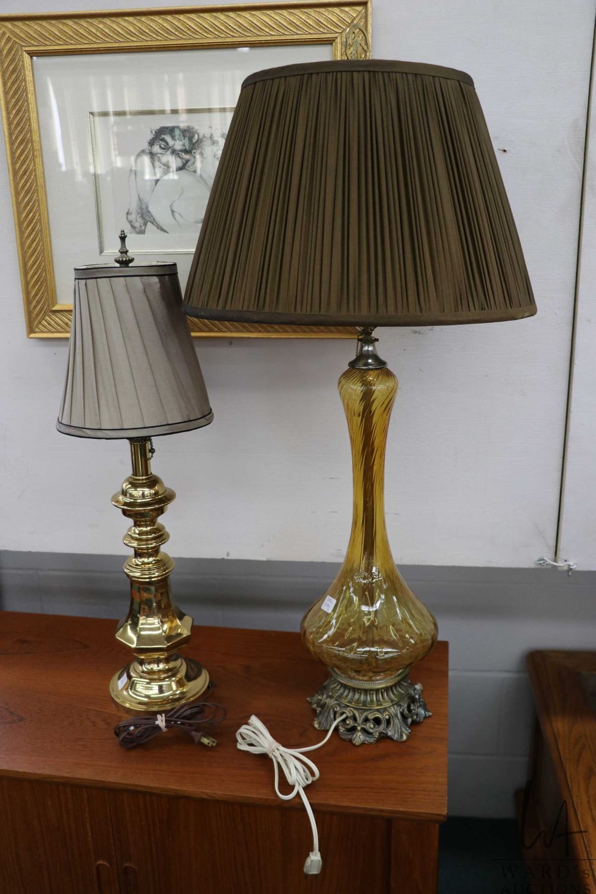 Two vintage lamps including brass table lamps and a blown glass lamp with brass base, both include s