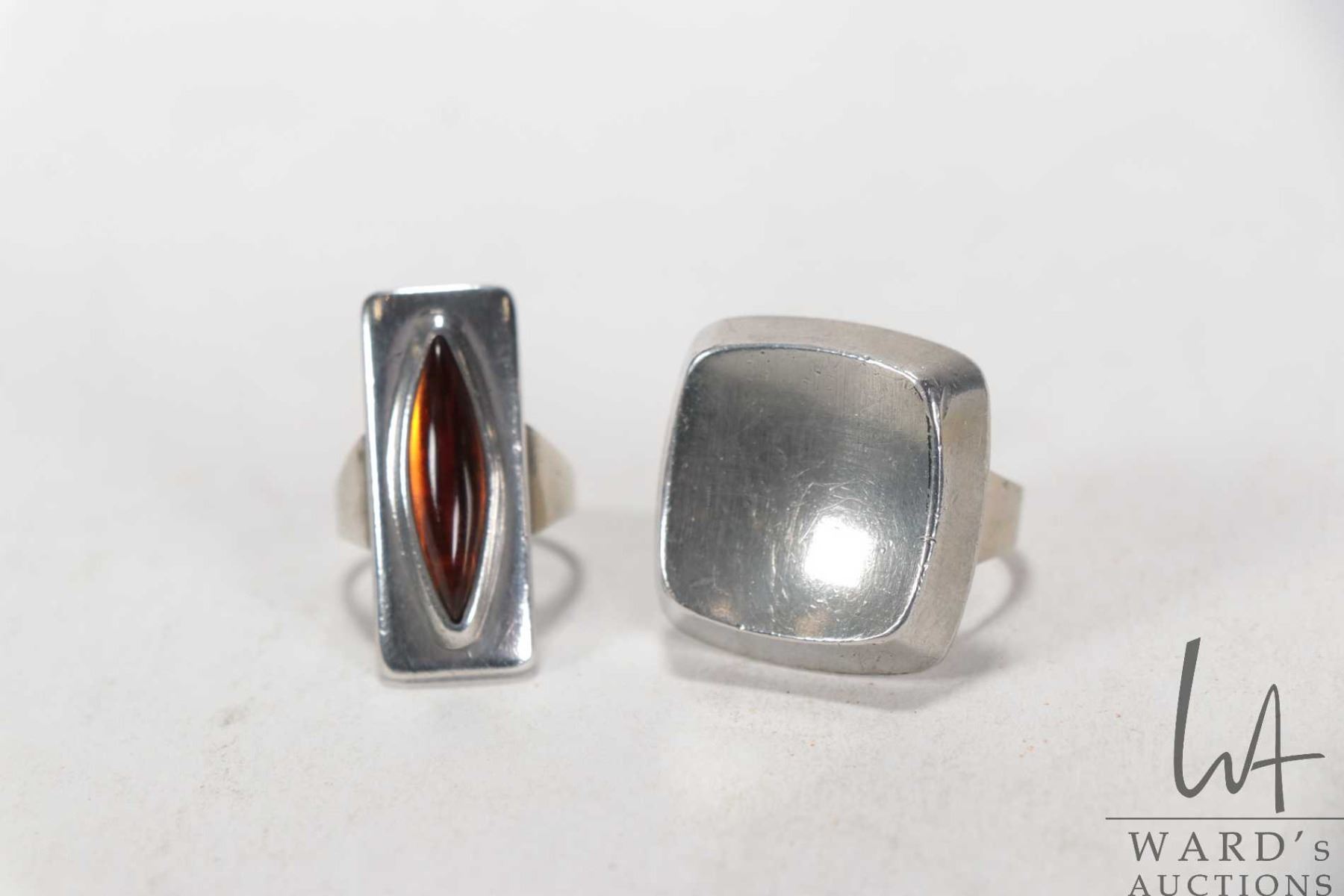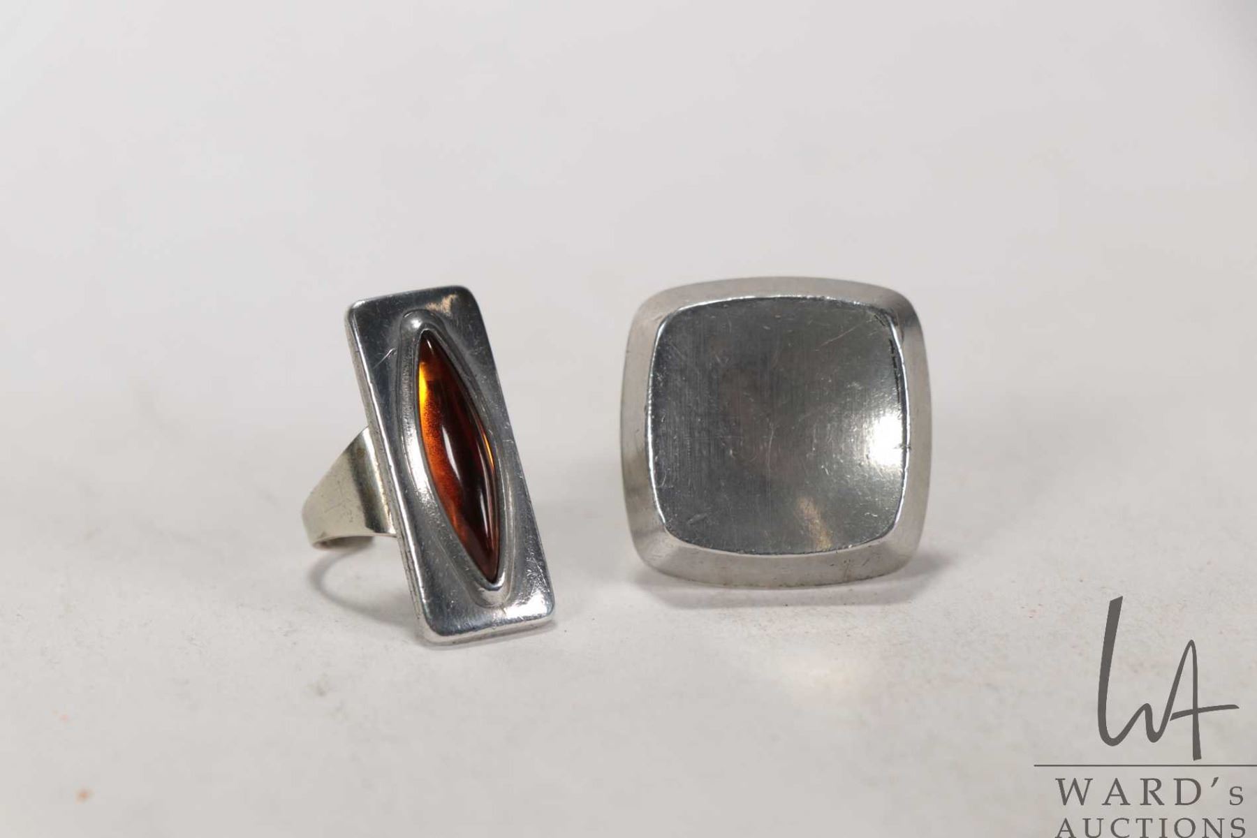 Two vintage mid century modernist adjustable rings by Jorgen Jensen of Denmark including amber coloured glass ring no. 230 and a square no. 311