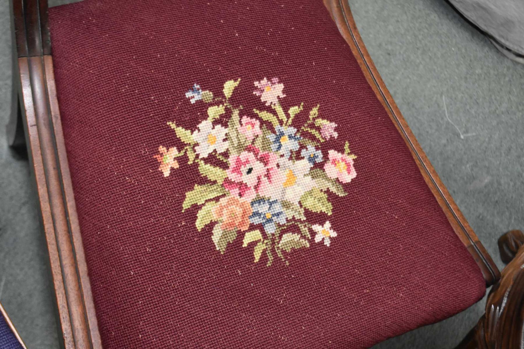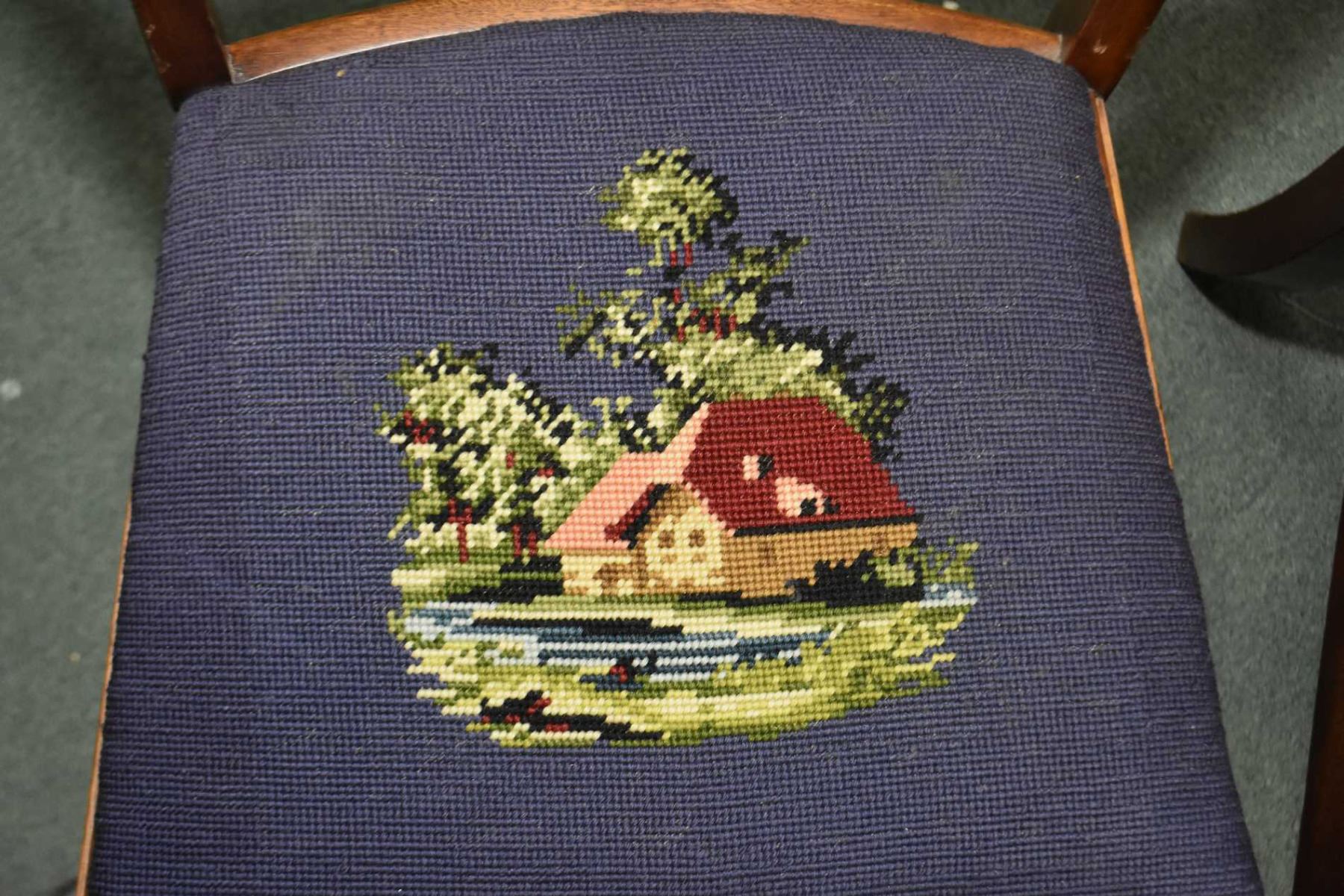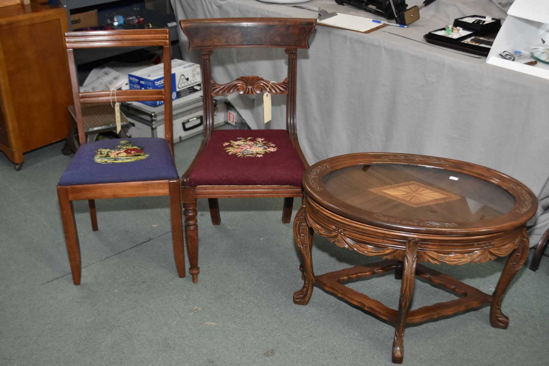 Two vintage needlepoint upholstered side chairs and a matched grain coffee table with removable drink's tray