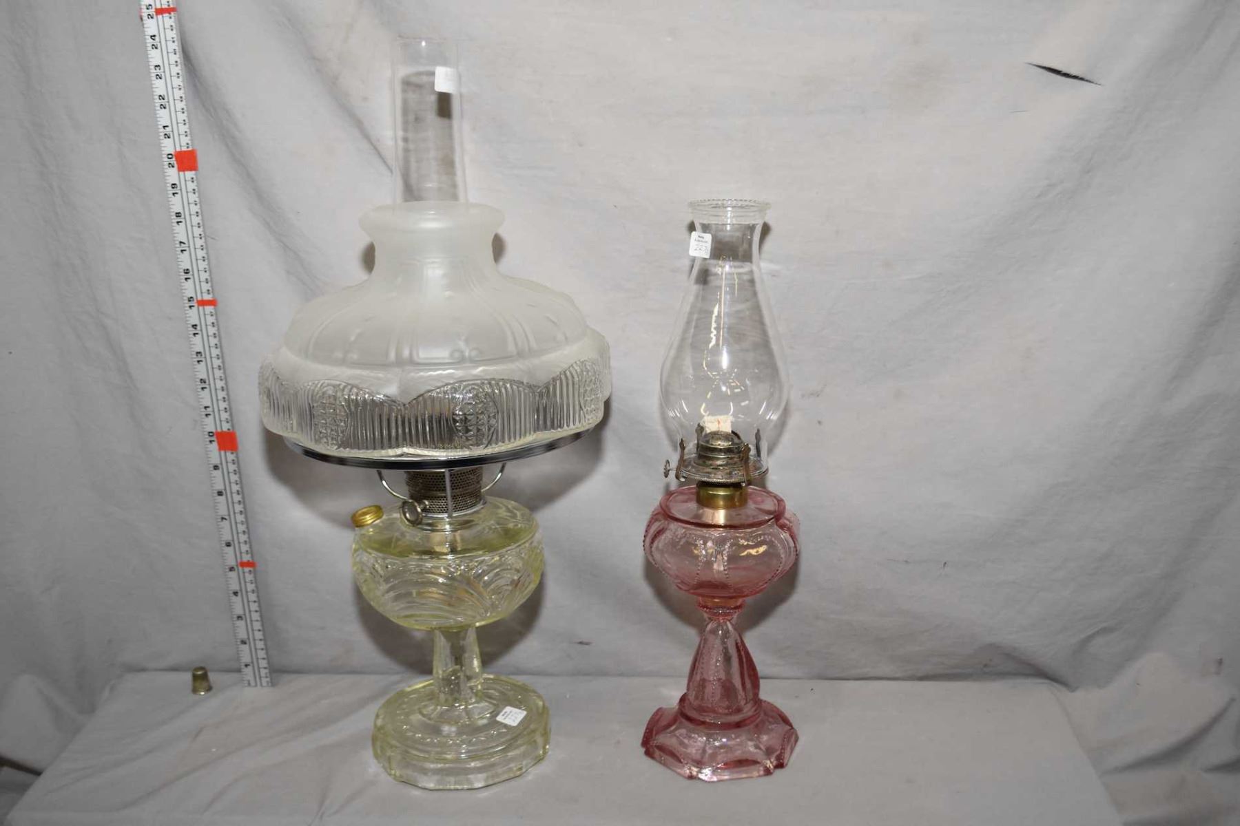 This item is not available for shipping. Local pickup only. Two vintage oil lamps including Aladdin Washington drape clear oil lamp with chimney and frosted shade and a pink oil lamp with clear chimney