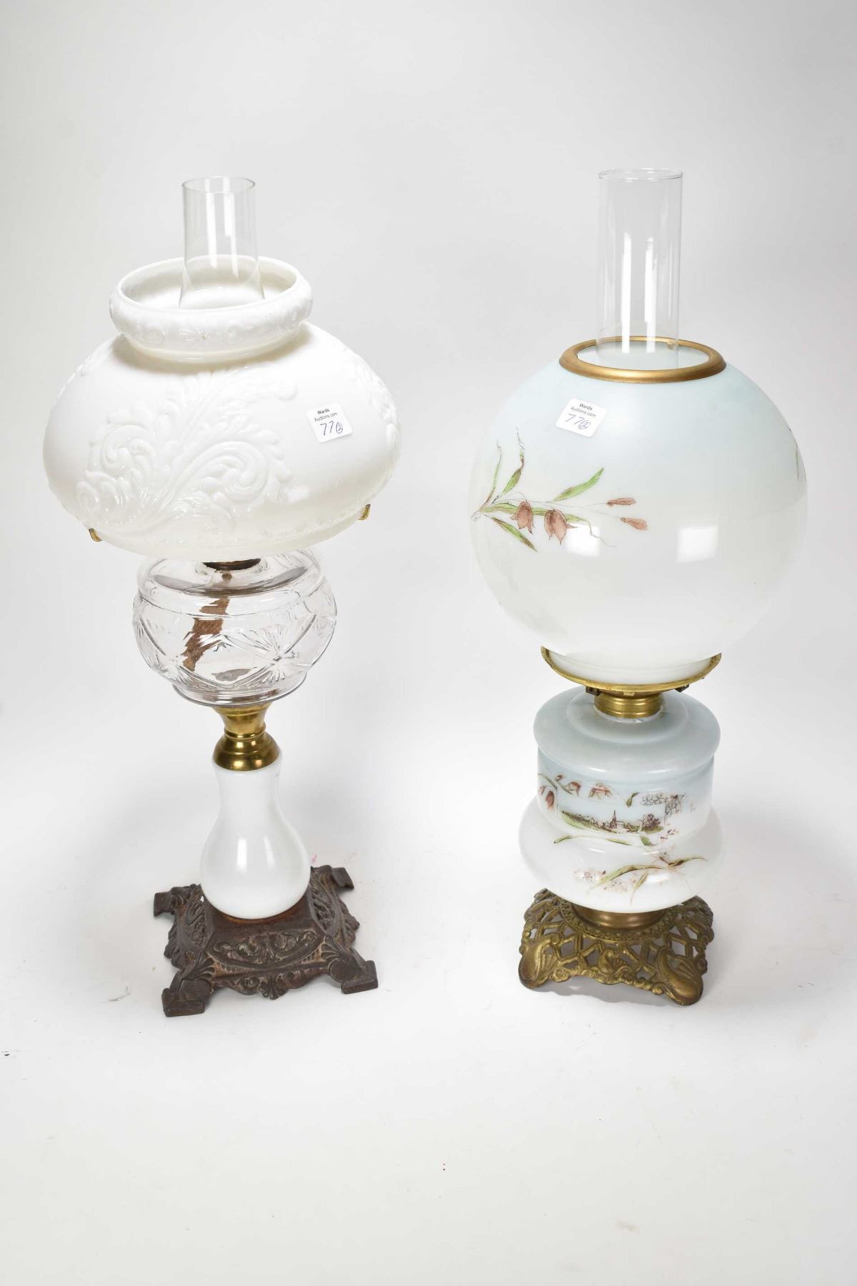 Two vintage oil lamps including one with milk glass and metal base with milk glass shade, a floral designed lamp with transfer ware font on cast metal base