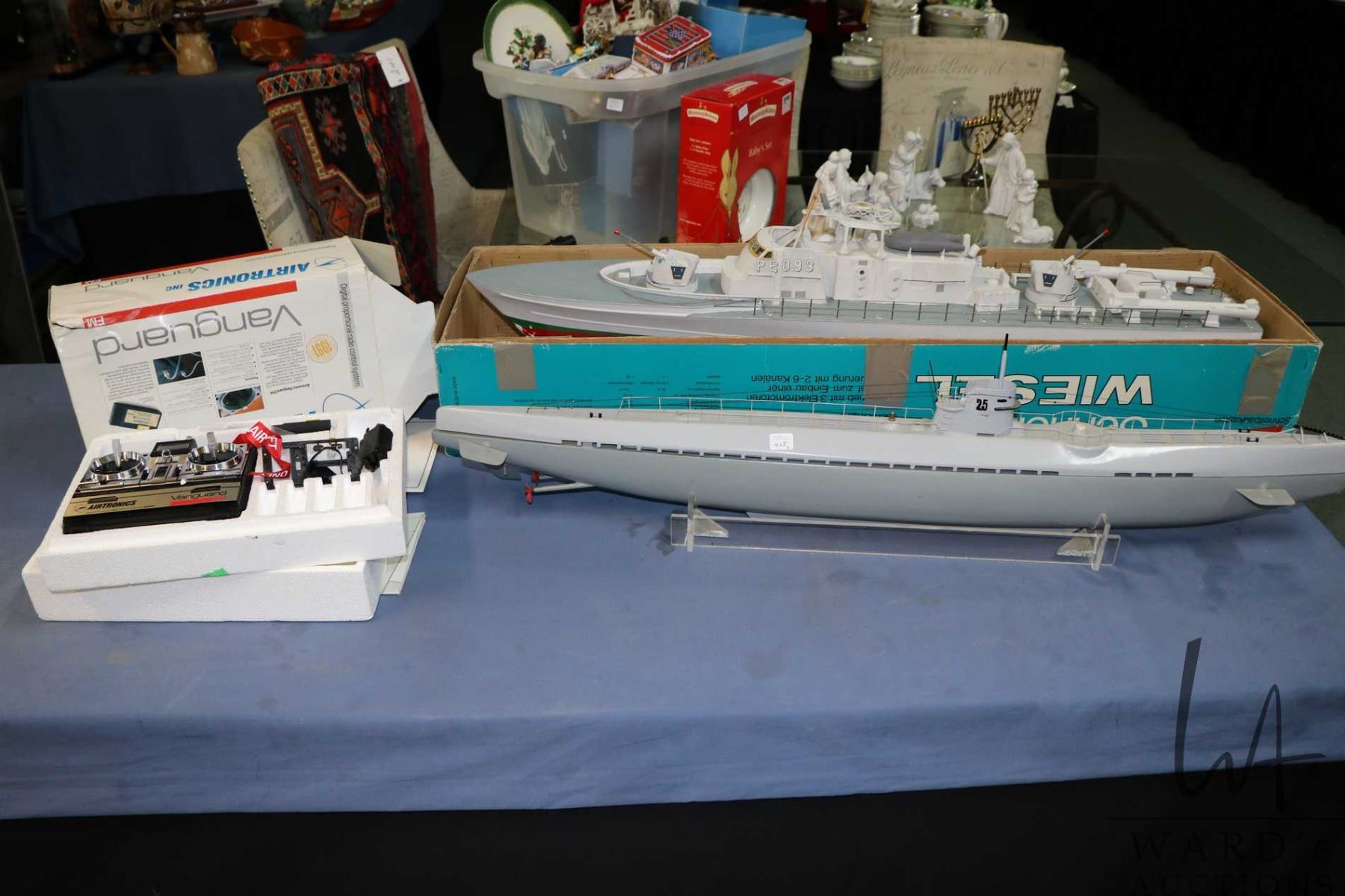 Two vintage radio controlled, battery powered German war ships including Schnellboot Wiesel 43" long with original box and a 42" long U-Boat and an Airtronics Vanguard FM controller with original box and manual, nothing has been tested at time of cataloguing