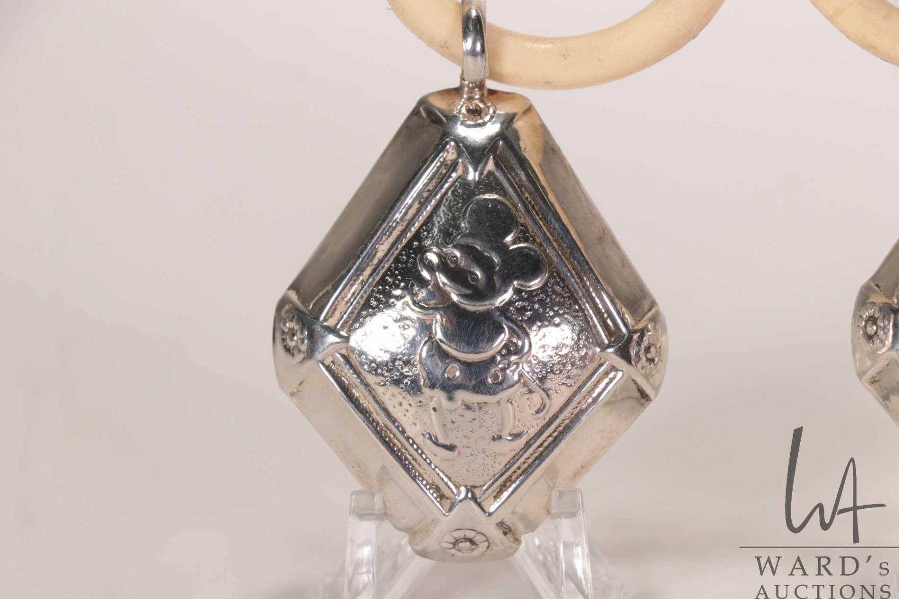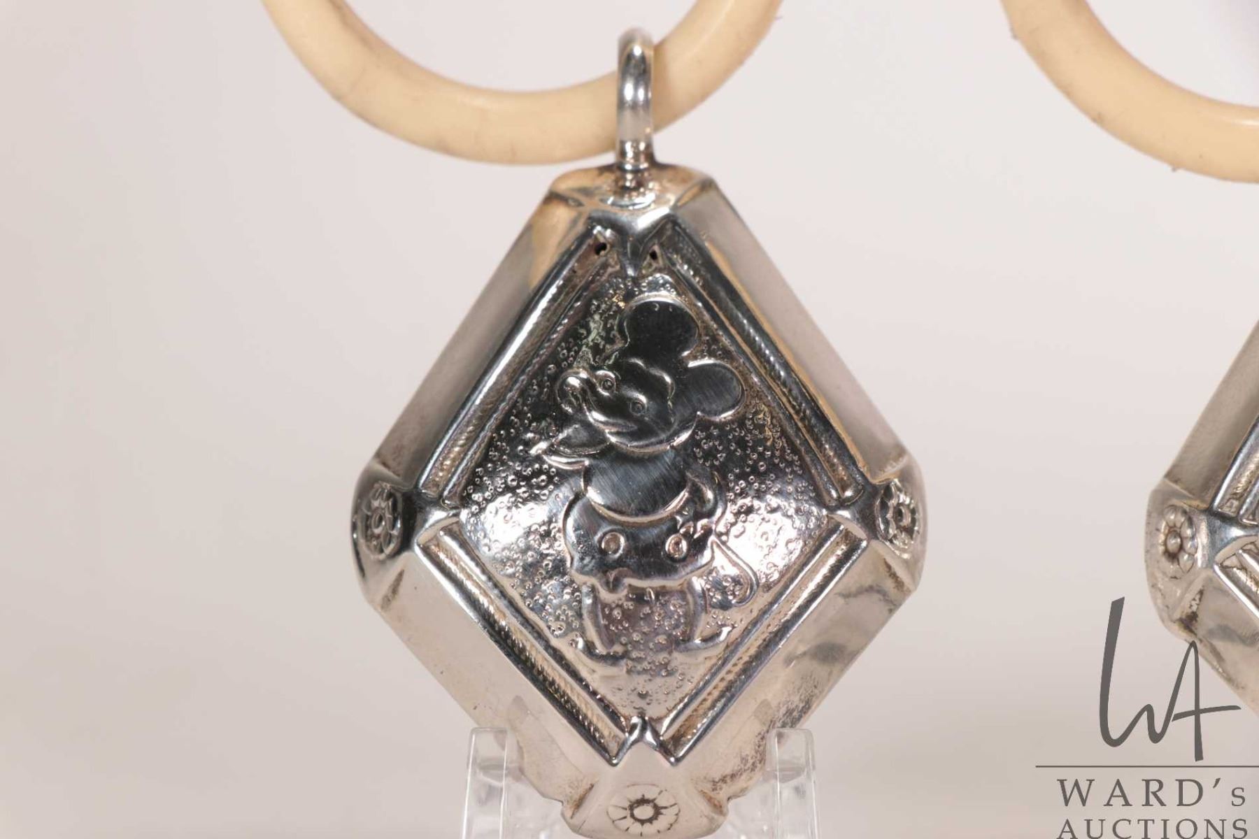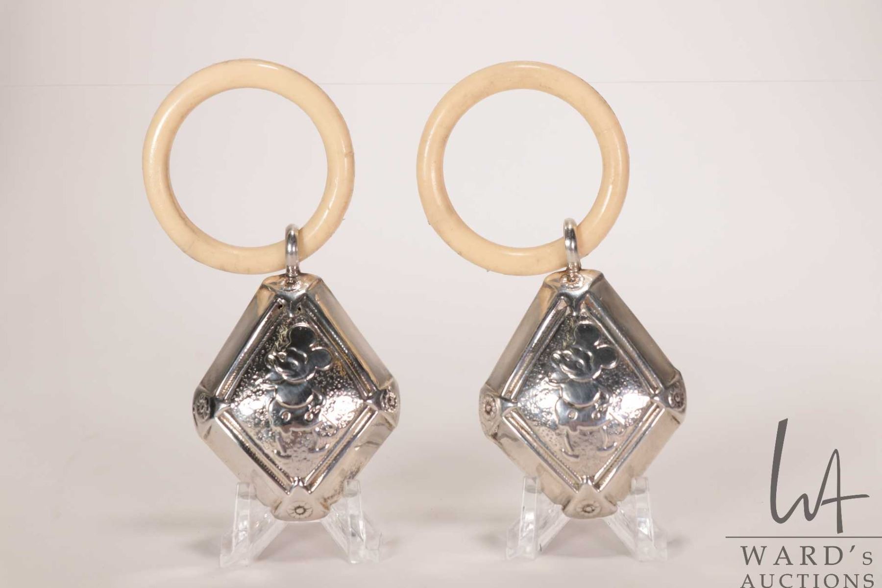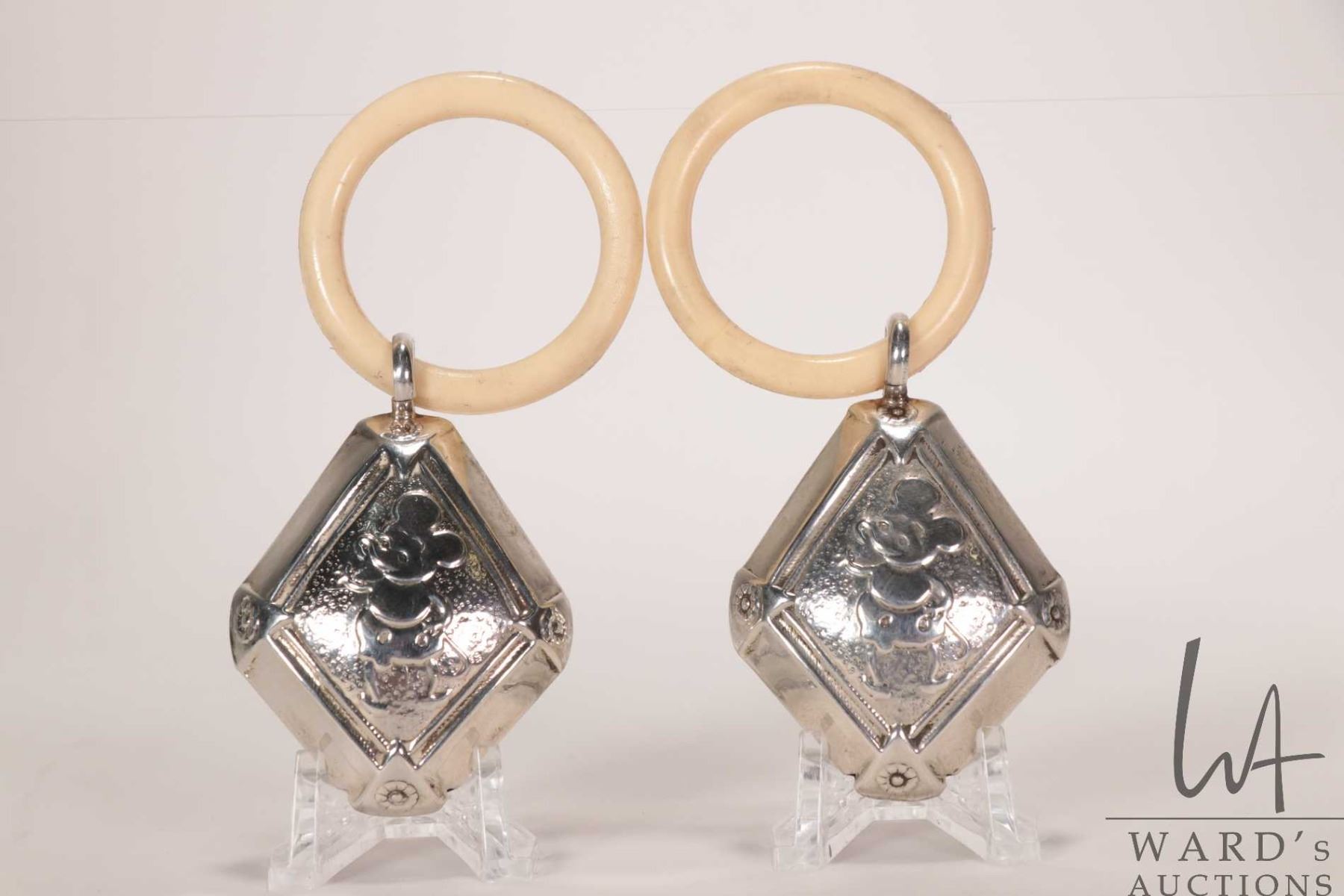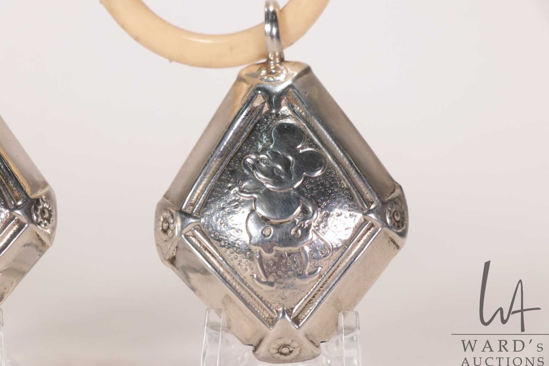 Two vintage silver Mickey Mouse motif baby rattles, no marks seen