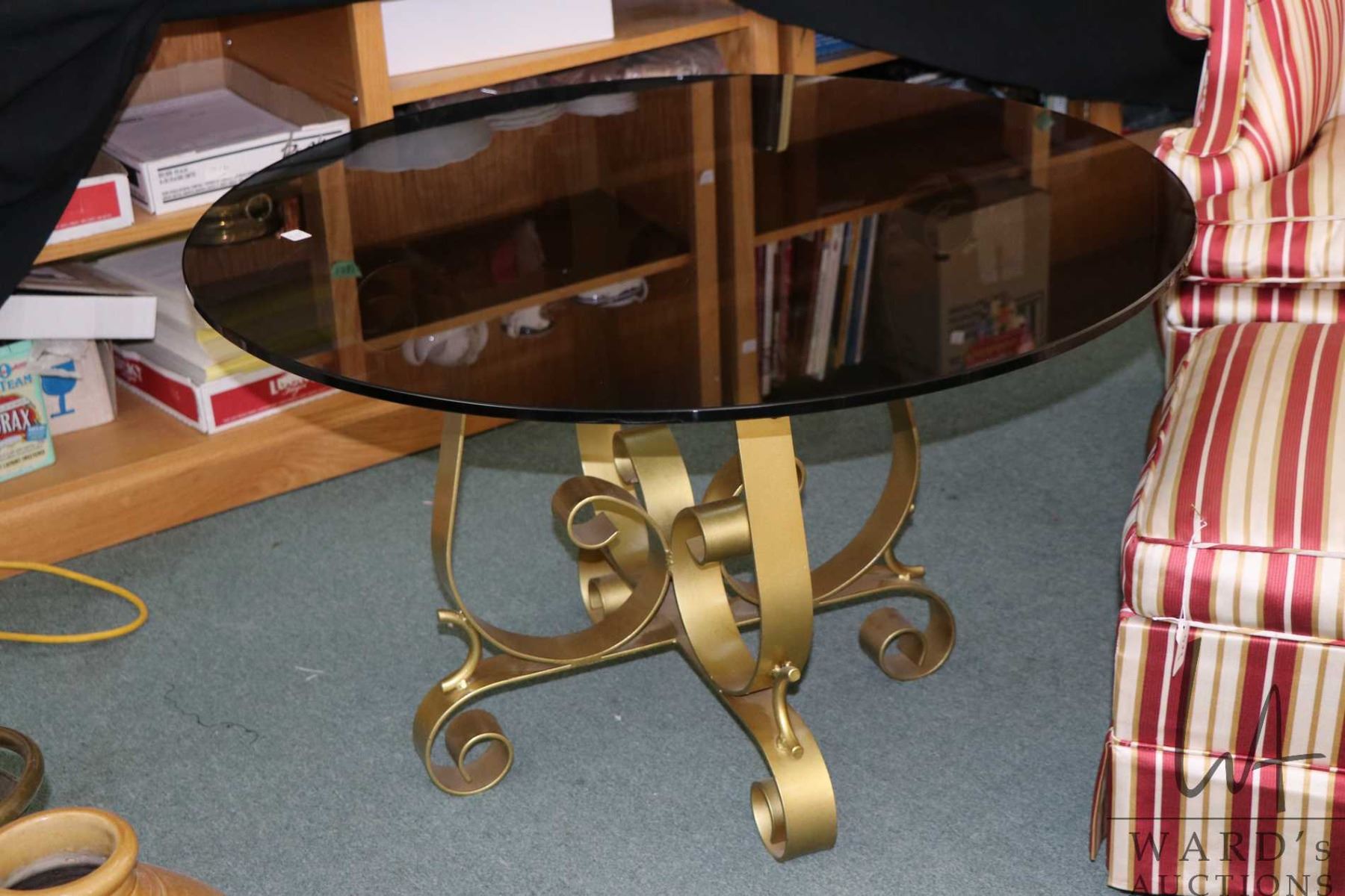 Two vintage smoked glass top tables on gold painted flat iron bases including 40" diameter coffee table and 36" diameter side table