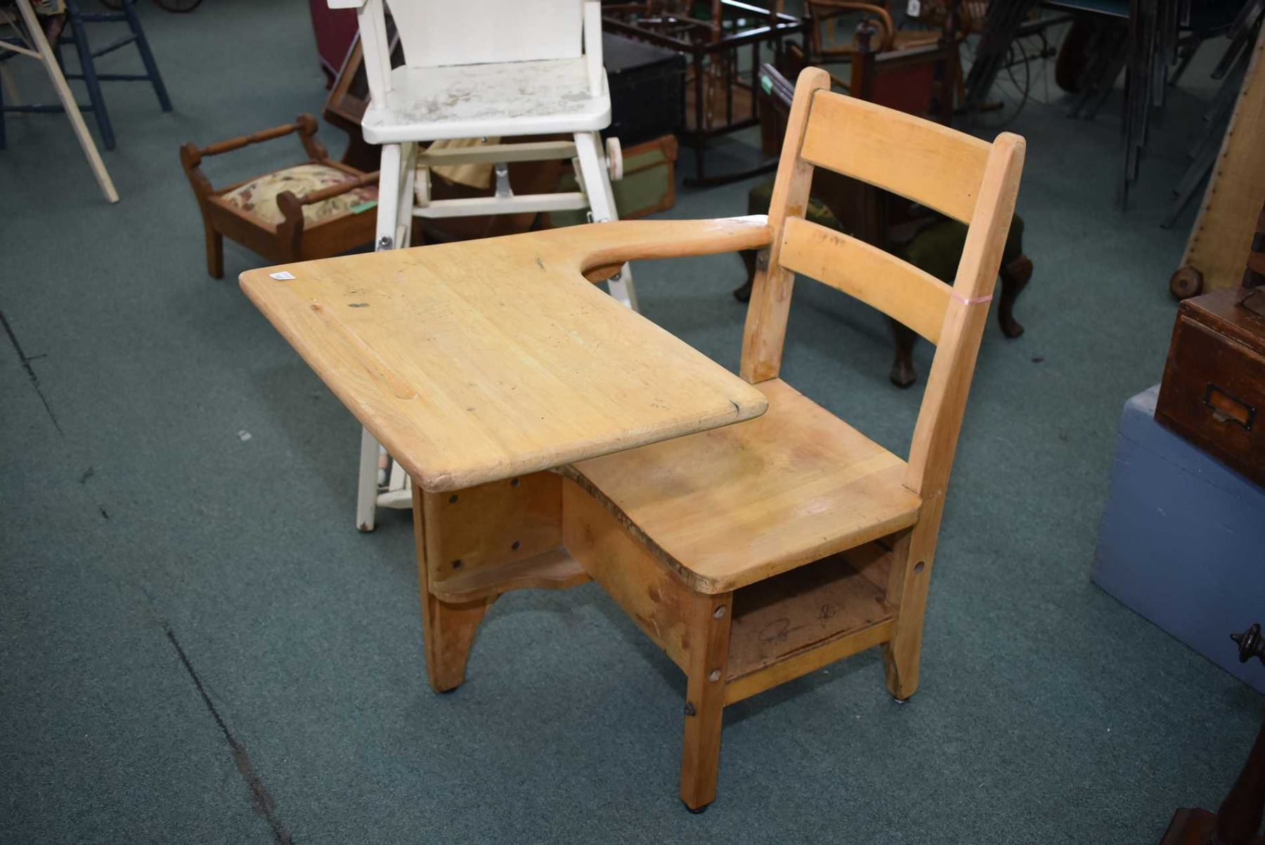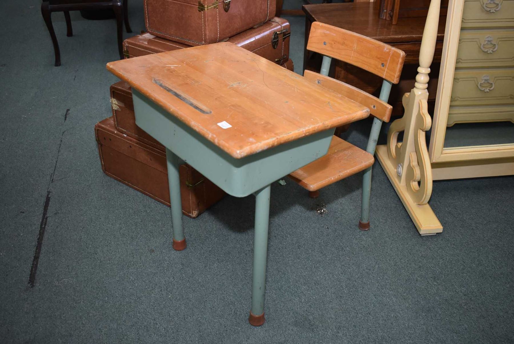 Two vintage student desks each with attached chair, one metal and wood and one all wood