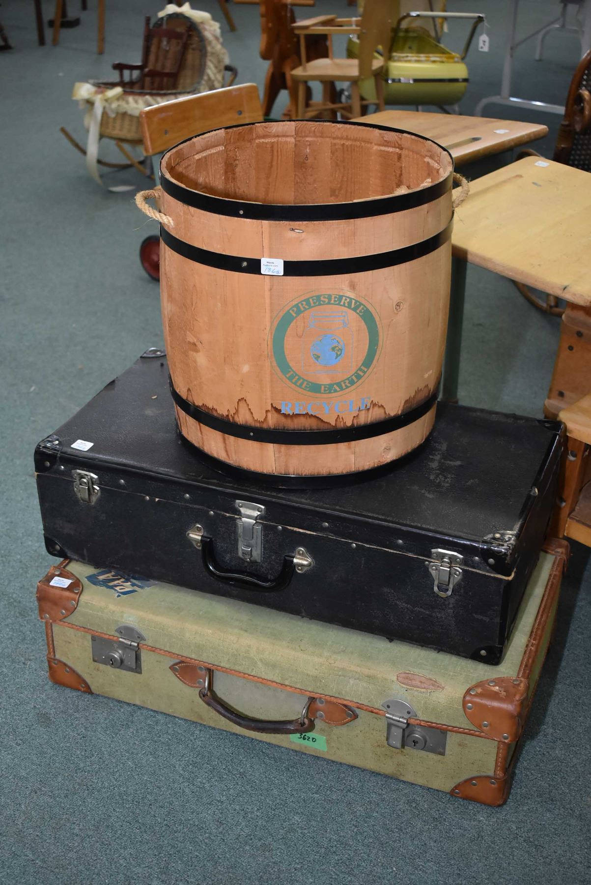 Two vintage suitcases and a modern simulated barrel with metal bindings for recycling