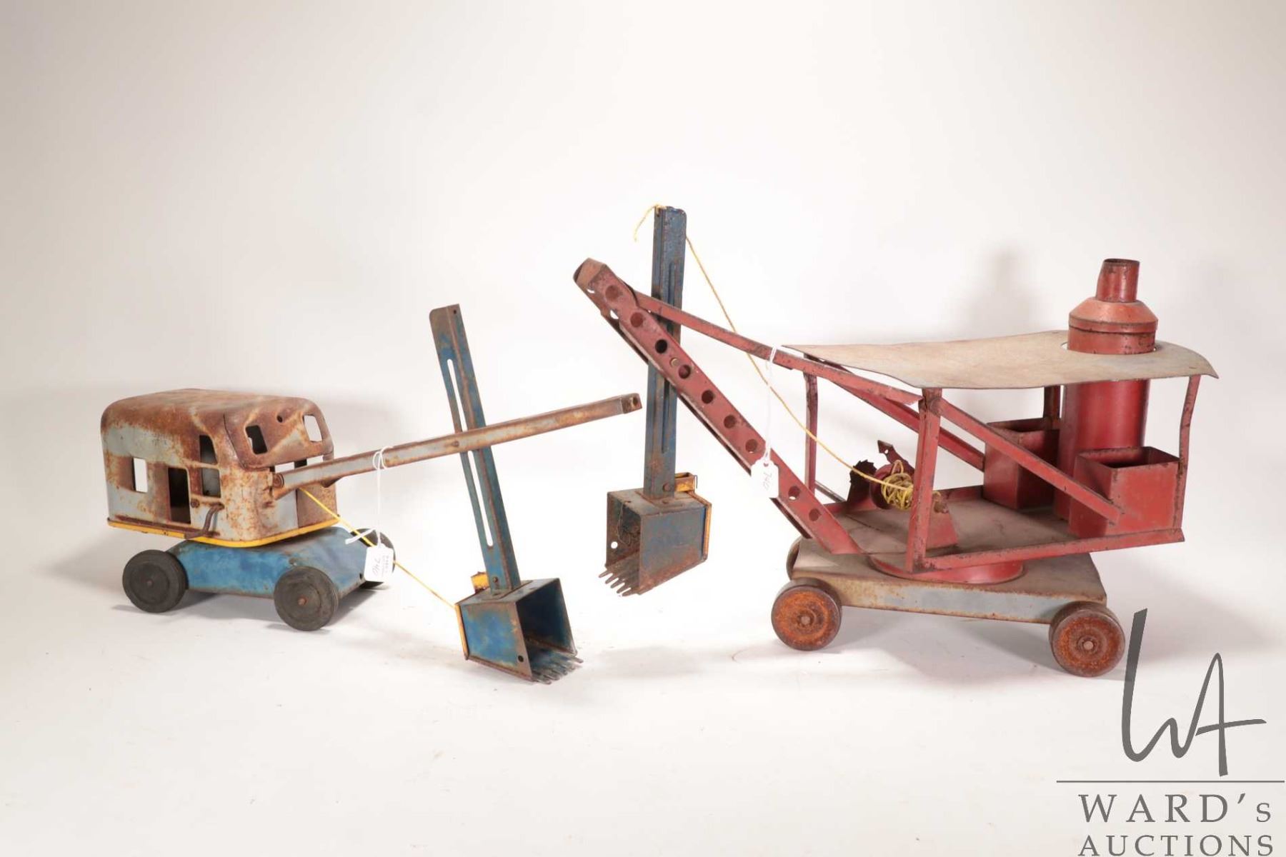 Two vintage tin toy steam shovels including 19" L X 7" H Wyandott and a Richards Toys 18" L X 12" H