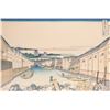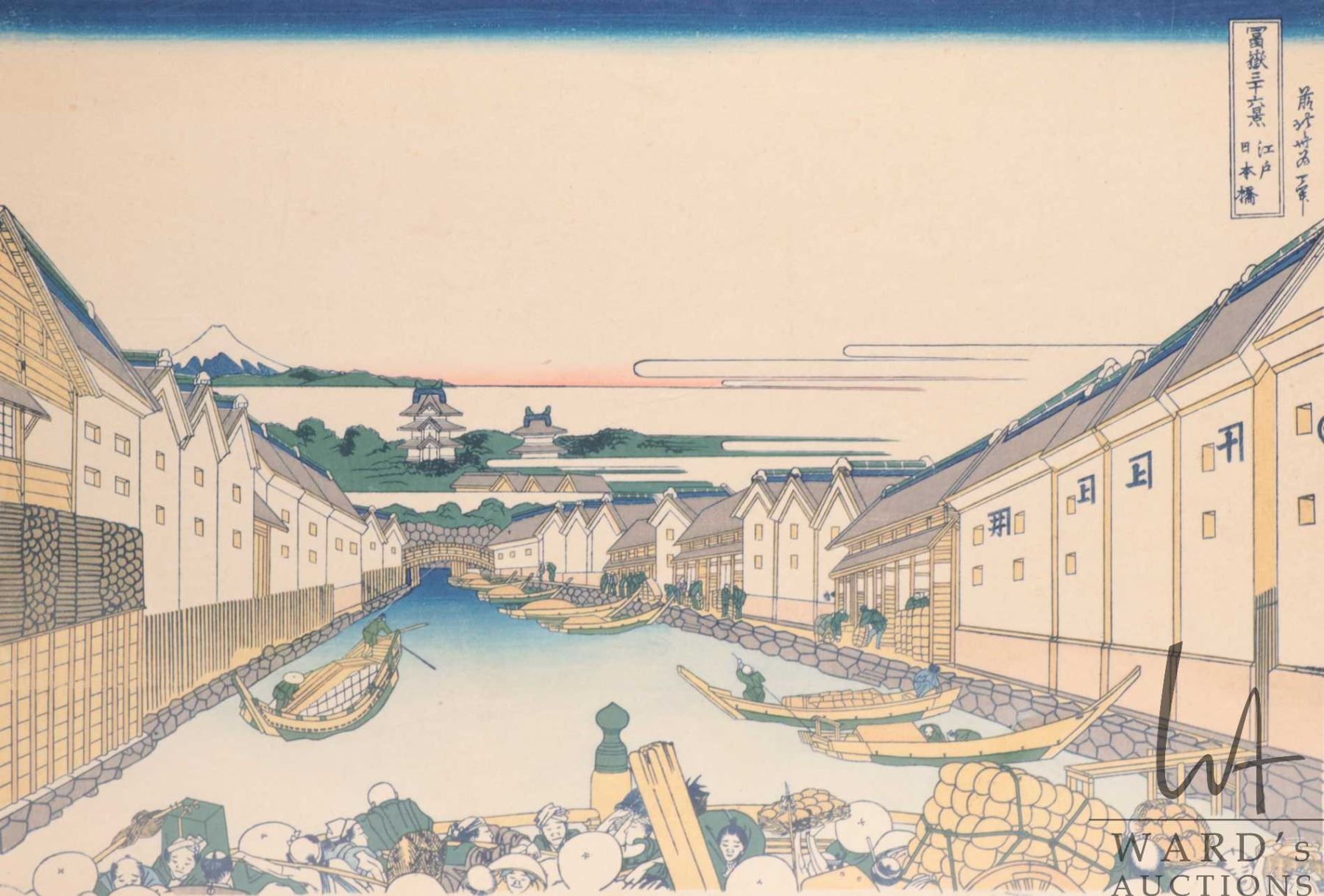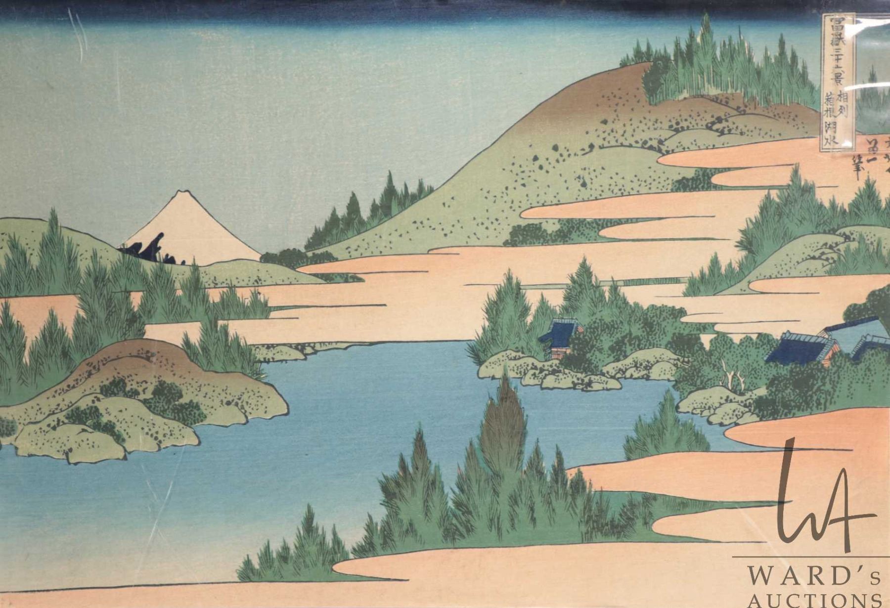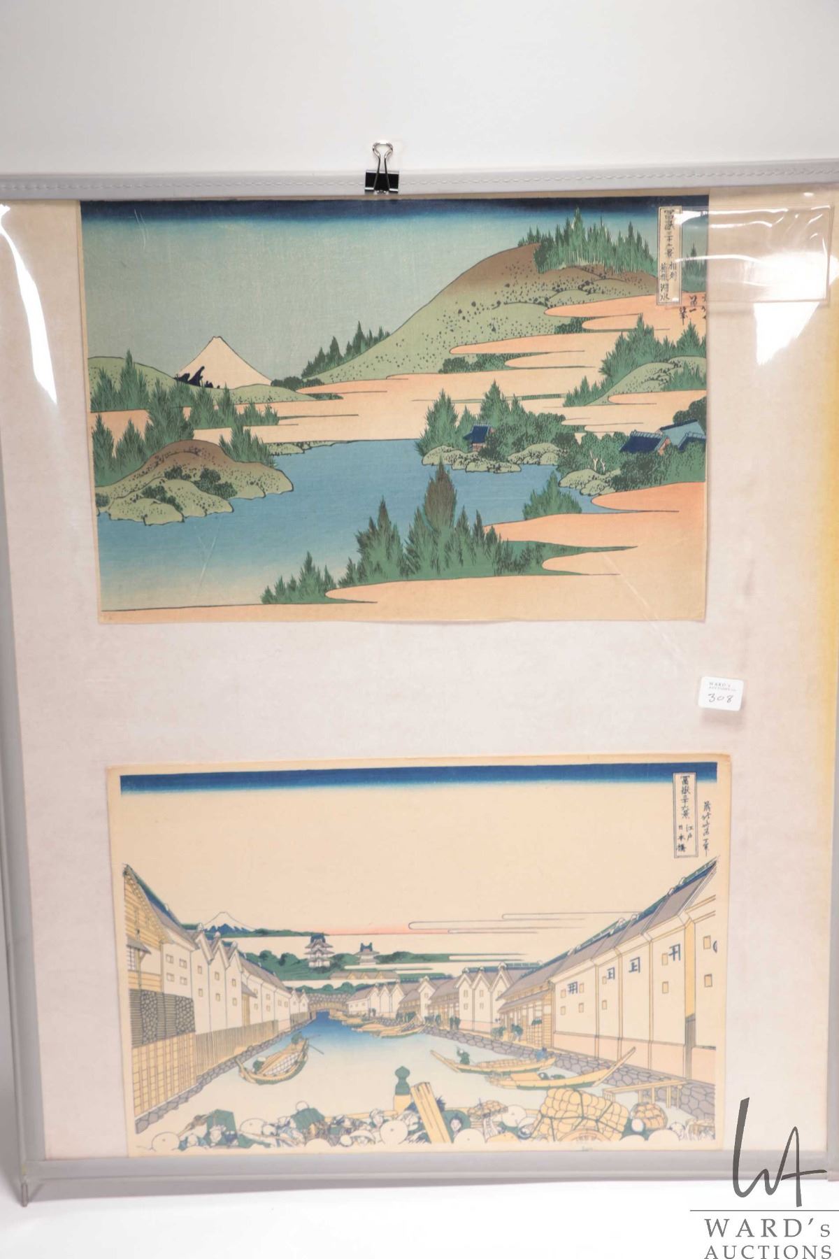 Two vintage unframed Japanese wood block print "Lake of Hakone in Sagami Province" no. 24 and "Nihonbashi bridge in Edo" no. 21 in the series of prints from the portfolio "Thirty-six Views of Mount Fuji", a series of landscape wood blocks by Japanese artist Hokusai (1760-1849) which were originally printed in 1830-1832. This is believed to be a mid century reprint