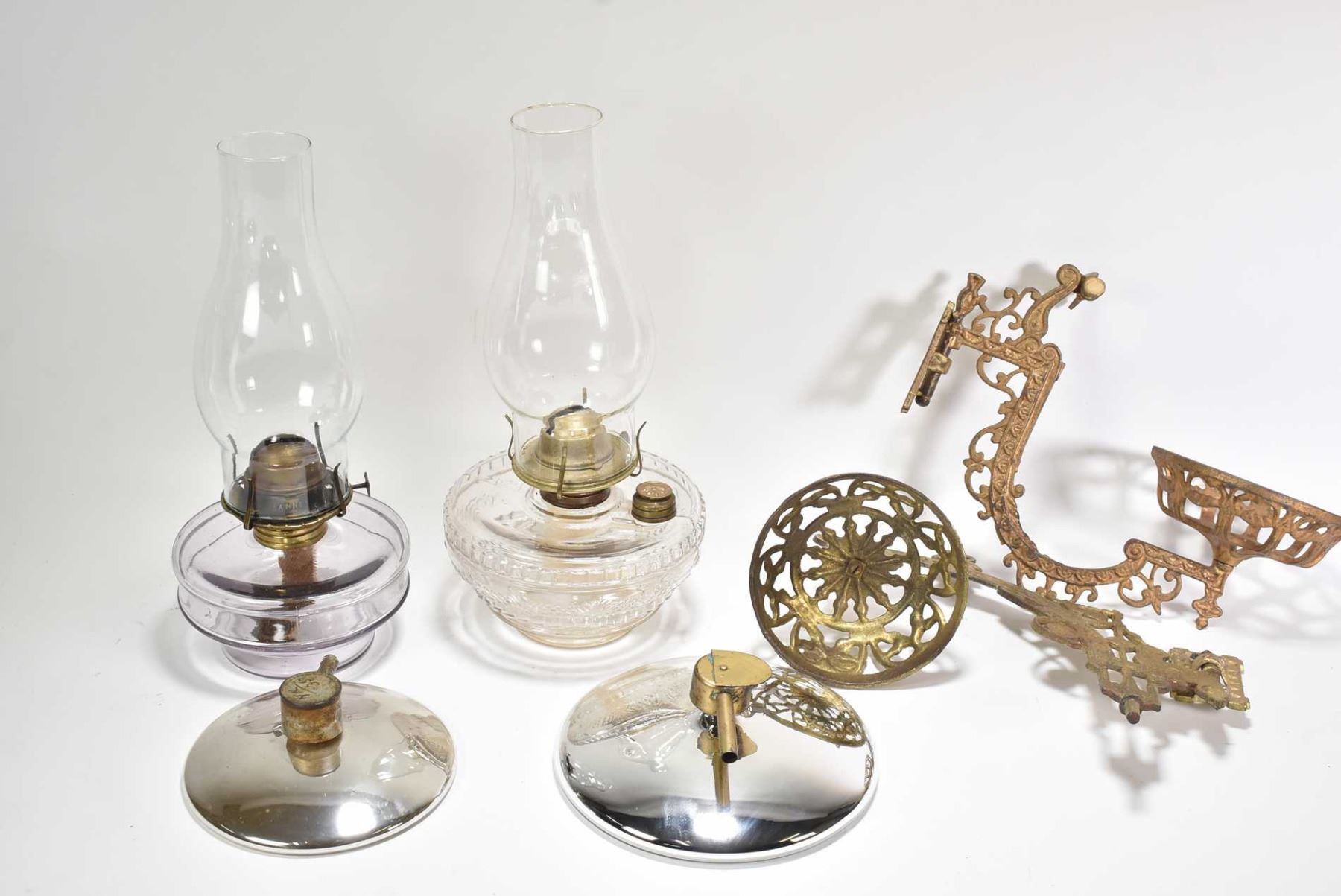 Two wall mount colourless oil lamps including brackets and reflectors, note one turning purple. Not available for shipping. Local pickup only