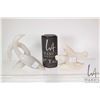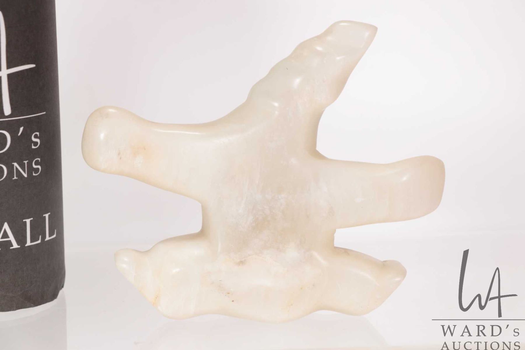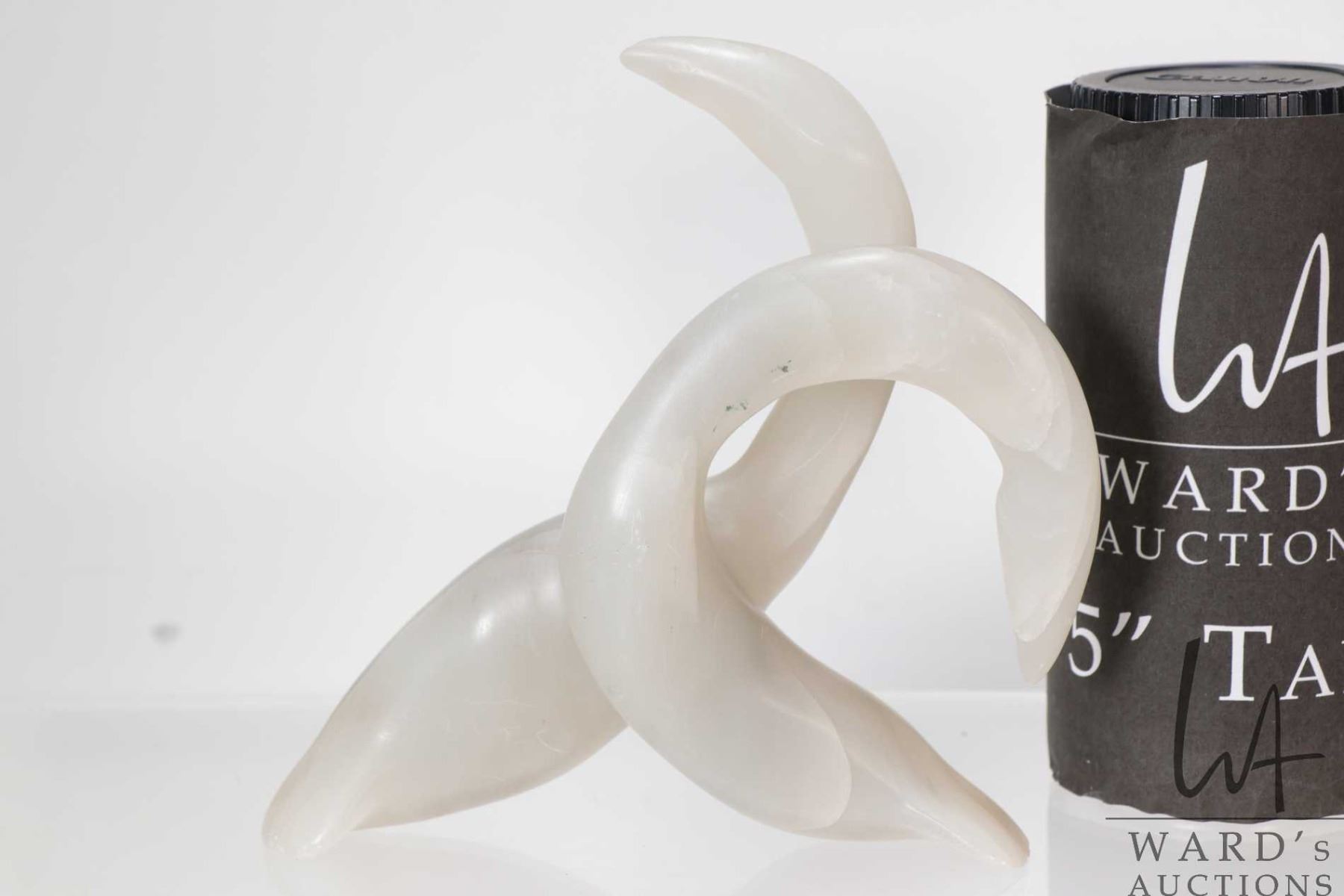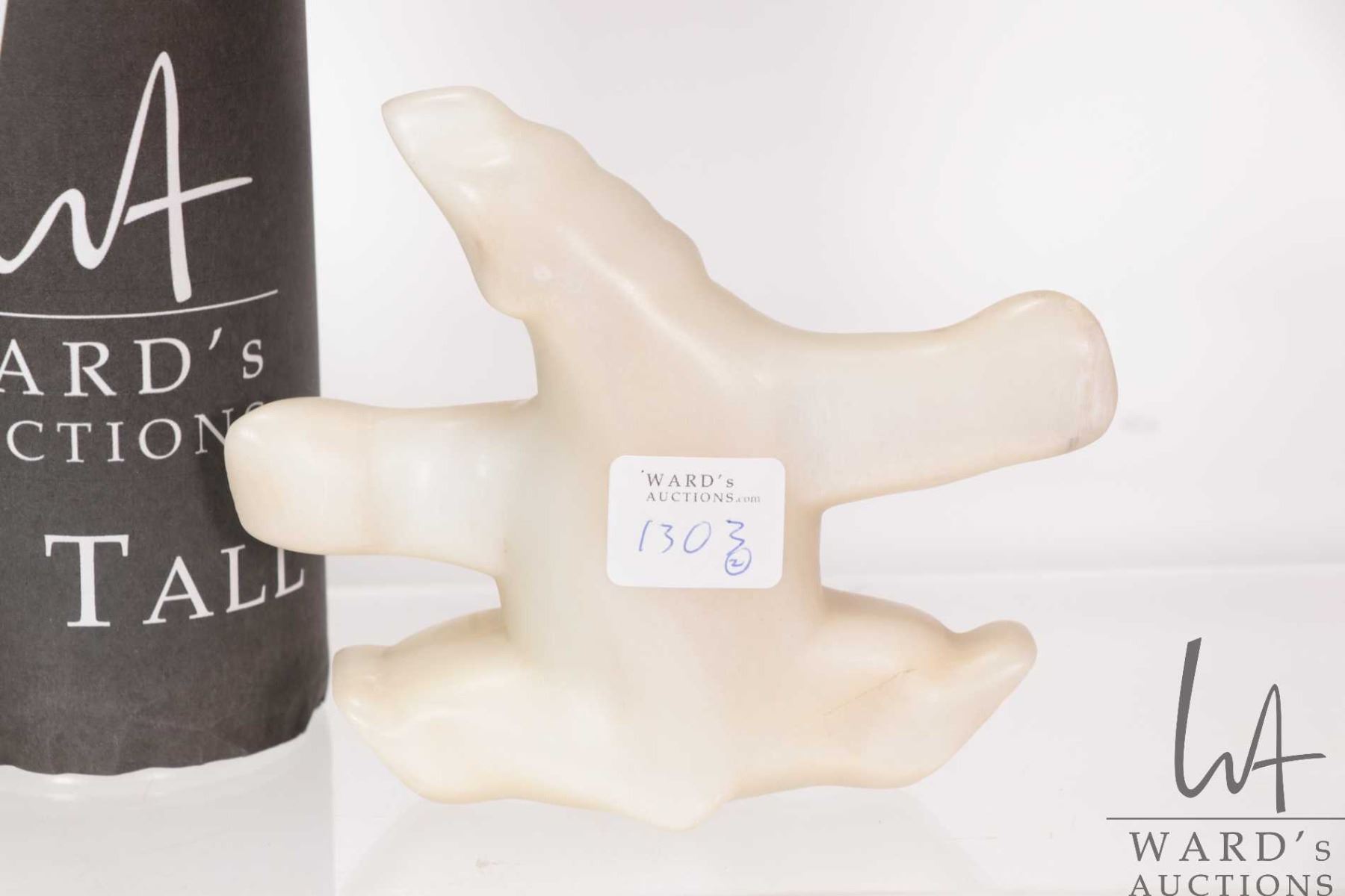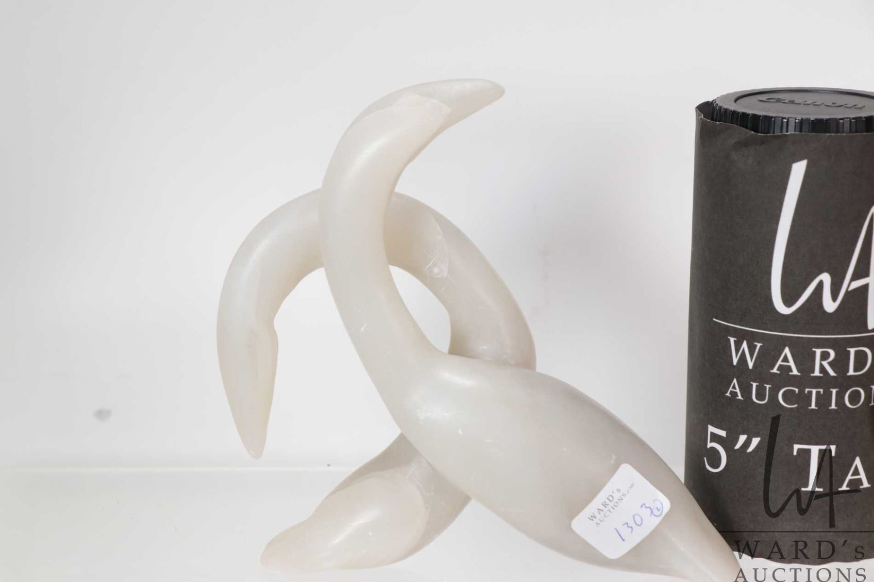 Two white soapstone carvings including a pair of whales, 6" in height and a 4 1/2" dancing bear, both signed by artist Tony Totan