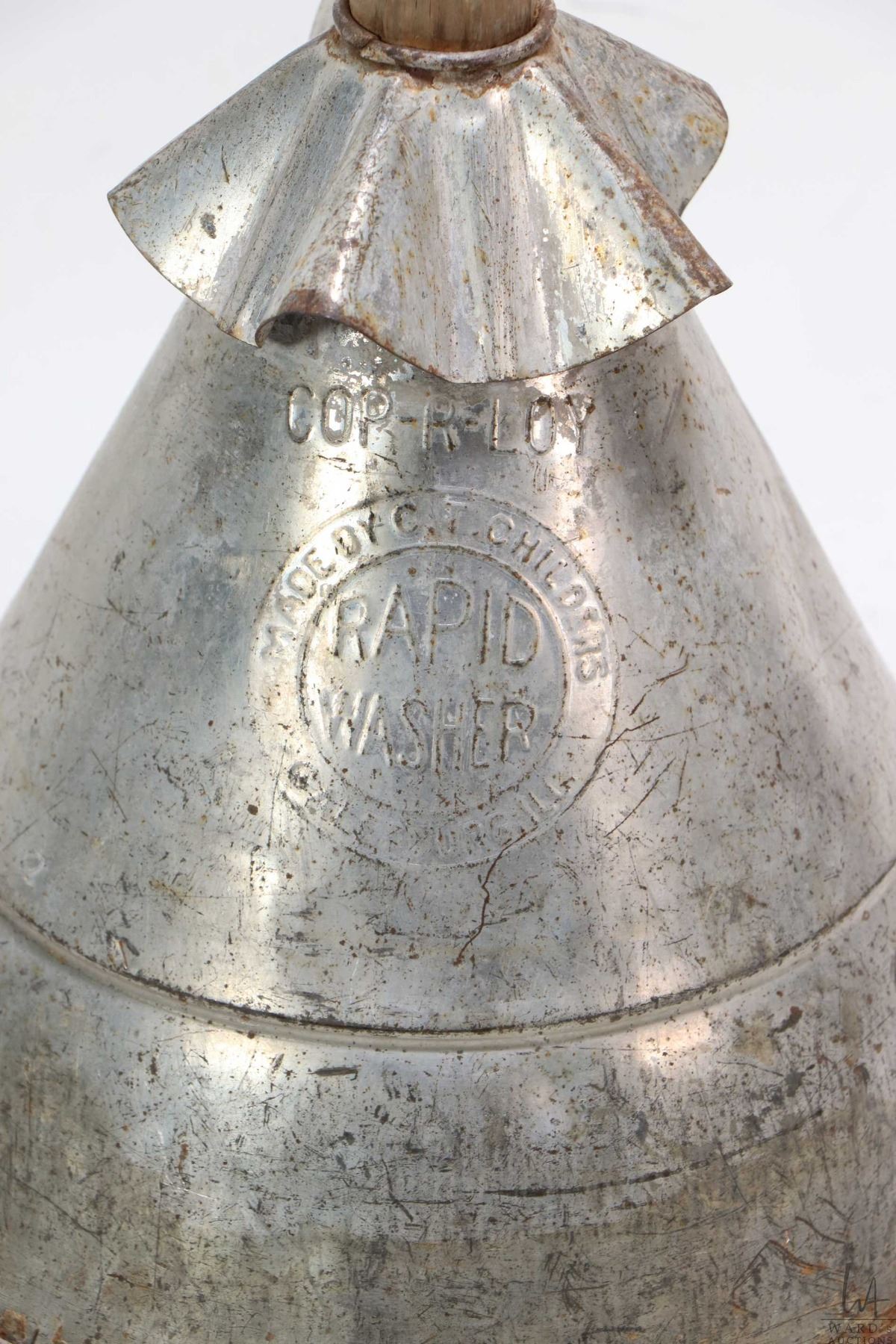 Two wood and metal washboard and a Warranty No. 11 wringer plus a Cop-R-Loy Rapid Washer laundry poss stick