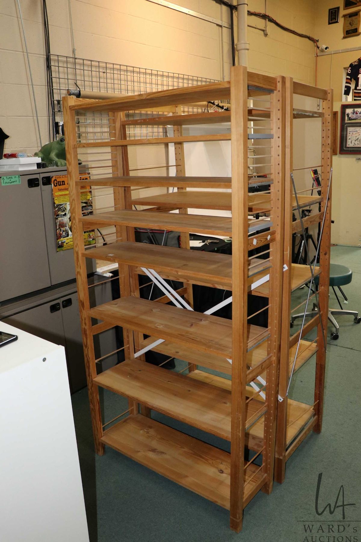 Two wooden, adjustable shelving units including 71" X 36" X 20" and 71" X 36" X 12" D
