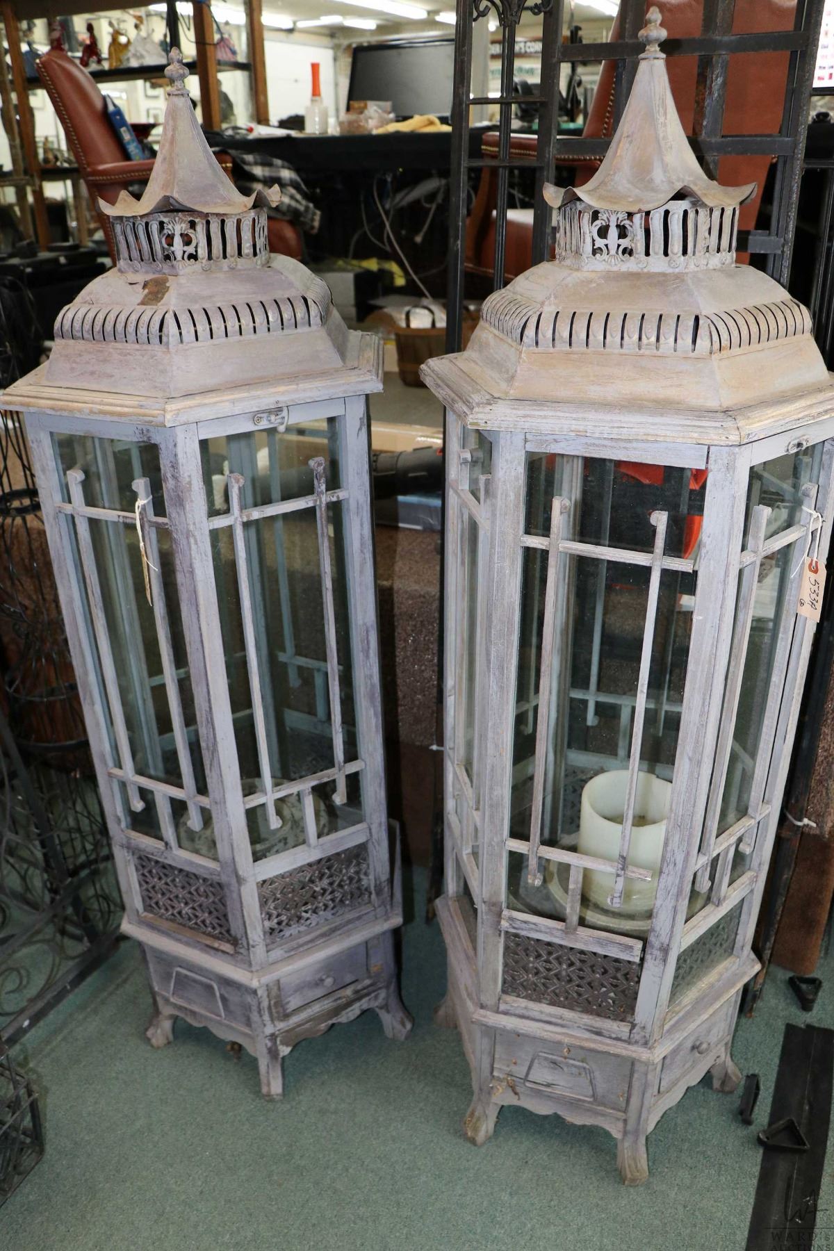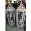 Two wooden and tin pagoda style garden candle holders with glass panels 58" in height. Note: Not available for shipment. Local pickup only