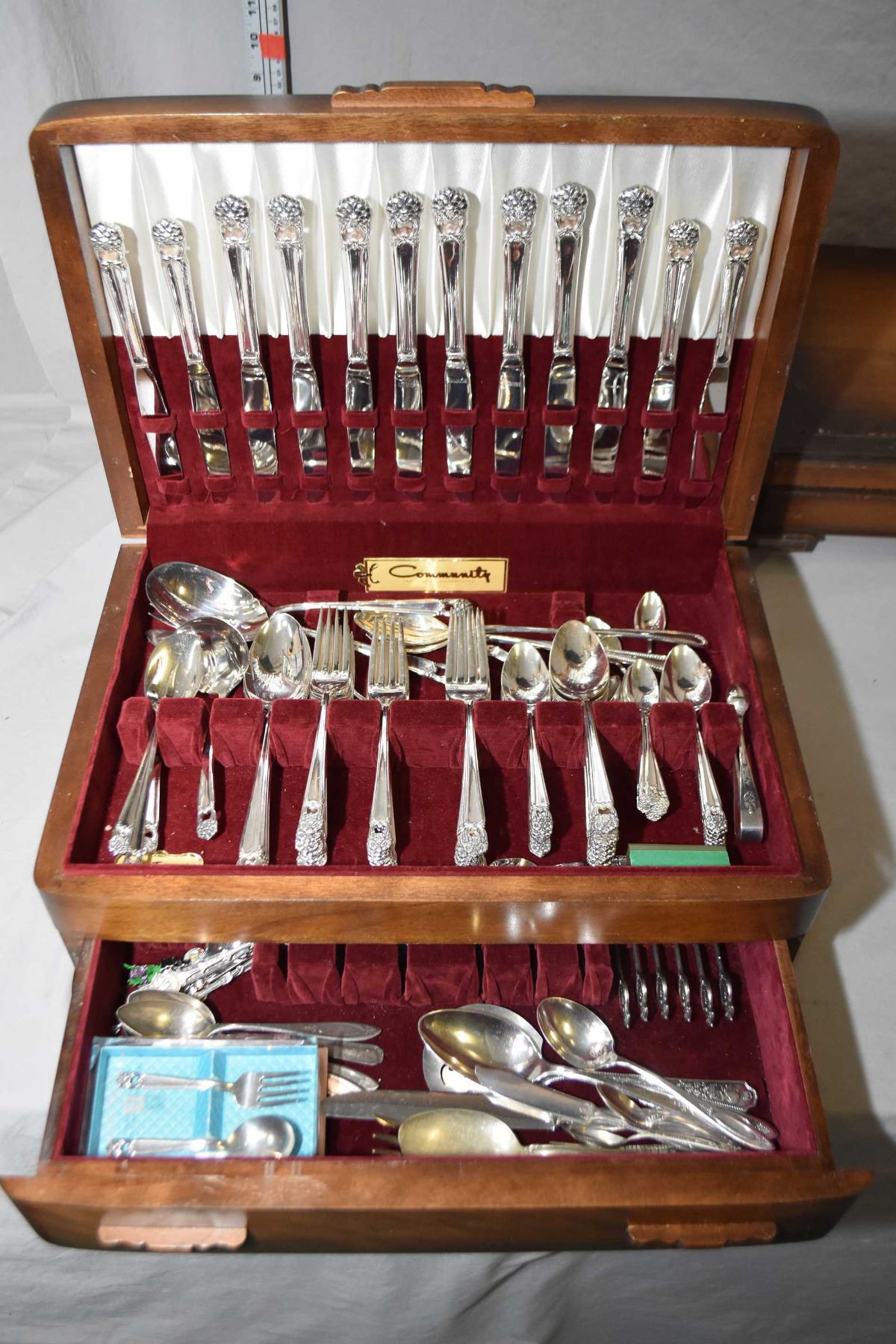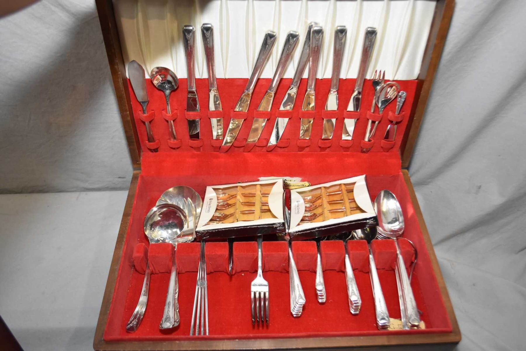 Two wooden canteens of silver-plate flatware including servings for eight of Community flatware with serving pieces and a canteen with settings for eight of Rogers Bros. including a selection of serving pieces, plus collectors spoons including some sterling etc.